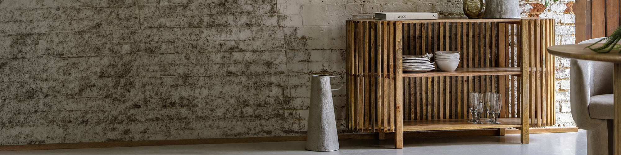 Voss is defined by vertical slats and open shelving that let the pieces breathe. The timber finish shows plenty of grain and variation, giving a natural warmth that feels lived in rather than glossy.