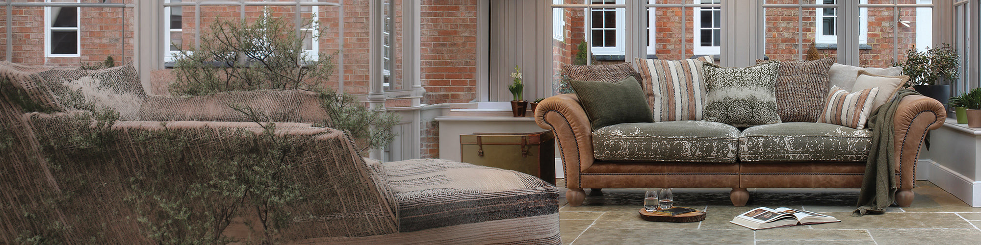 Tetrad Montana brings together sofas, a snuggler, wing chair and stool with a more generous, settled feel than sharper contemporary upholstery. The shaped arms, deeper seats and combination of leather and patterned fabric give the range its distinctive character, balancing warmth and texture with a more polished finish.
