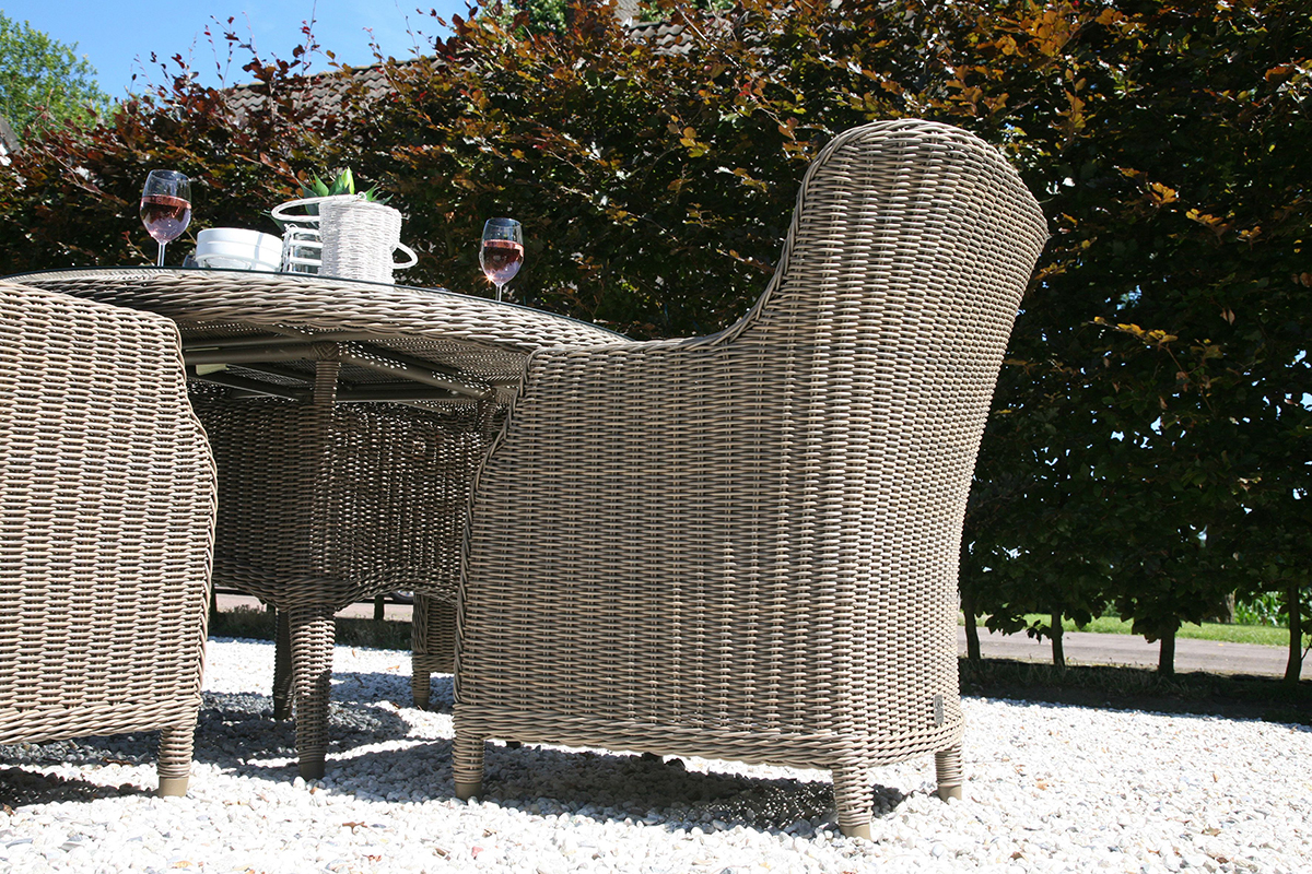 This Set comprises: •1 x130cm Victoria Round Dining Table inc Parasol Hole in Praia Weave (W-130cm D-130cm H-78cm) •4 x Brighton Dining Armchairs inc Cushions in Pure Weave (W-70cm D-76cm H-95cm)