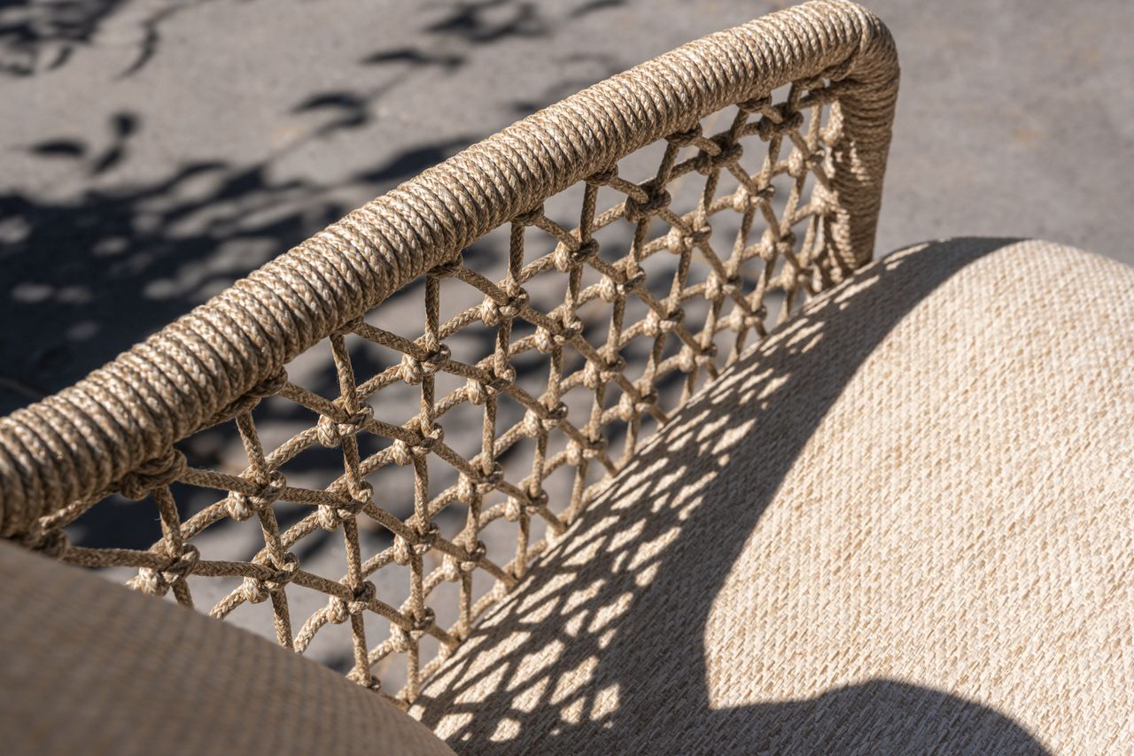 Puccini is engineered around a mix of premium materials: powder-coated aluminium (and stainless steel in rope structures), hand-woven rope, and solid teak accents. This layering of materials strikes a balance between structure, natural warmth, and artisanal craftsmanship. Features such as intricately braided rope wrapping around seating elements lend both visual depth and ergonomic support.