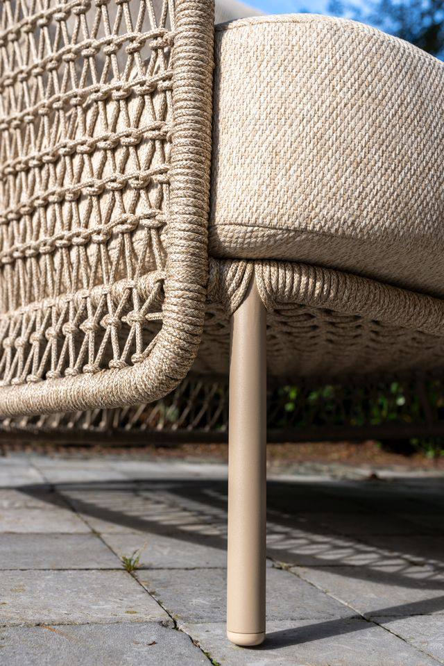 The Puccini collection brings together texture, warmth, and refined lines to create a visually striking yet comfortable outdoor range. The tone that defines it is Latte, used consistently across the frame, rope detailing, and cushions giving the collection a soft, cohesive identity.