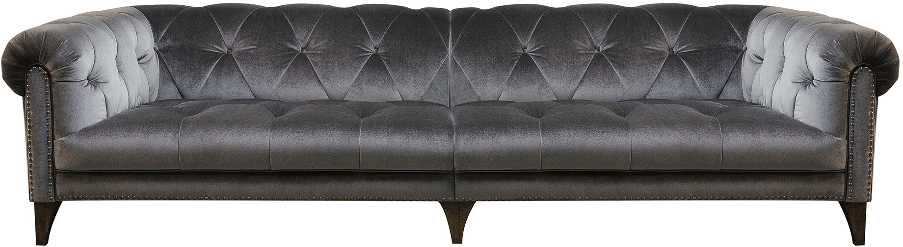 Sleek classic with hand tufted buttoning detail. Additional hand applied studs are a precious detail and the hardwood legs are super elegant.