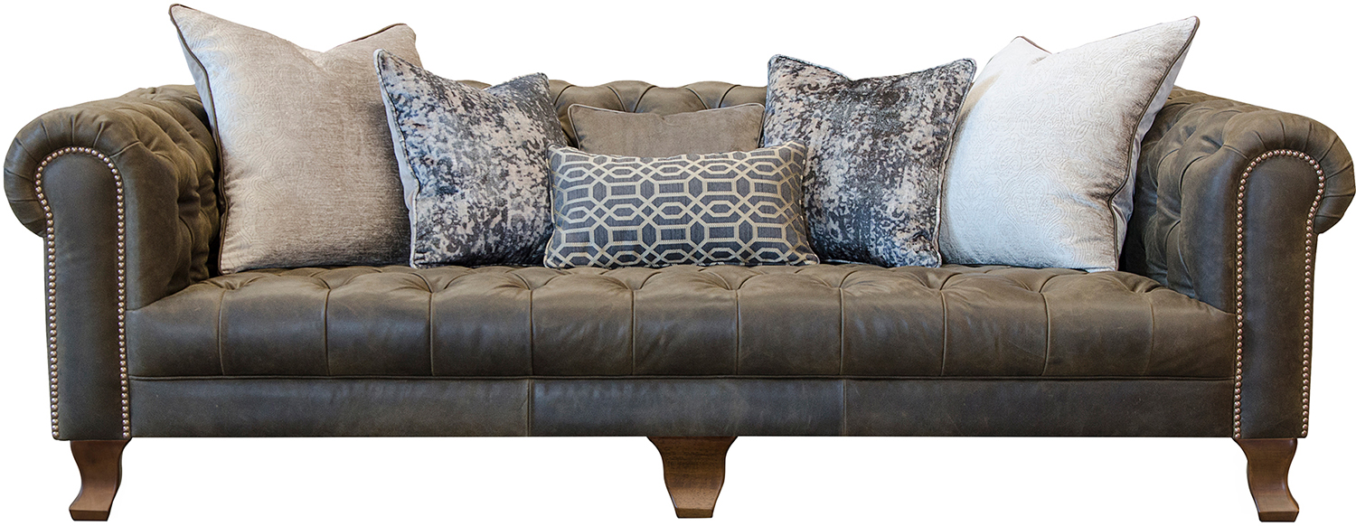 The Vivienne Maxi Sofa (including scatters) By Alexander & James is a classic Chesterfield sofa with robust scrolled arms and generously deep seating. This beautiful collection is recognisable for its complete hand buttoned seat, back and arms finished perfectly with hand studded detailing. Available in a range of natural buttery leathers and luxurious fabrics, this versatile sofa would suit any home. The scatter cushions are filled with a feather, foam and fibre mix, inviting you to sit back and relax. Plump and dress your furniture regularly to keep your furniture looking its best. Shown in Jin Black.