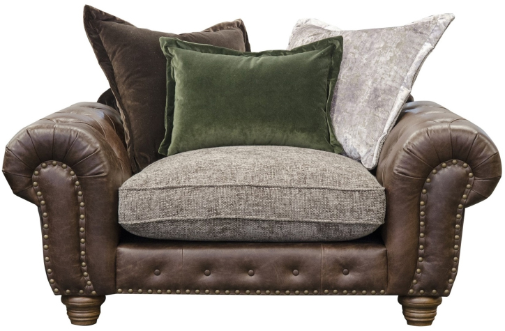 Shown in: Satchel Nutmeg leather, Alpine Stone Seat Cushion, Allure Moss Bolster Cushions, Antique Studs and Weathered Oak feet