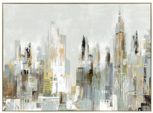 Art Marketing City Limits A majestic skyline featuring a diverse array of architectural marvels. This abstract canvas employs neutral tones to evoke a bustling atmosphere, while textured gold foil embellishments elevate the city’s spirit. A calming sky serves as a striking juxtaposition.