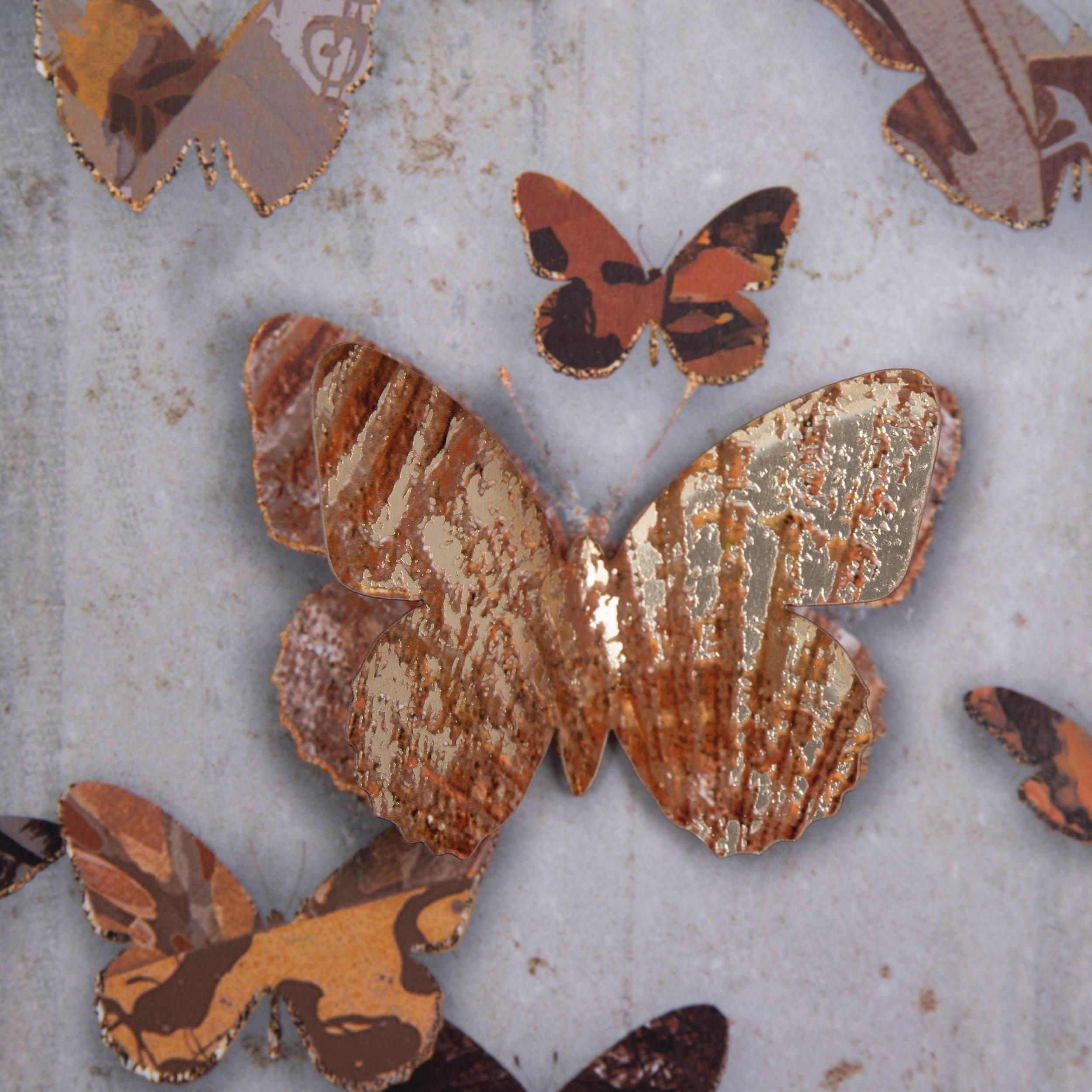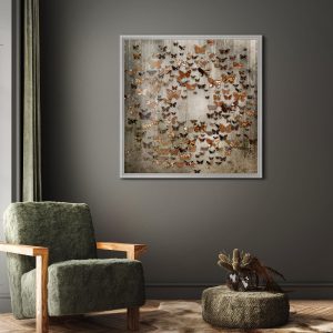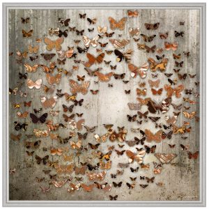 Art Marketing Gilded Wings Drawing inspiration from her Watch Tree series, Ulyana Hammond has shifted her focus from the concept of time to the ephemeral in this collection of intricately crafted paper butterflies. Each butterfly, die-cut, raised, and foiled, features wings gilded with autumnal tones of copper, bronze, and gold, bursting forth from the frame with an exuberant, fluttering vitality.