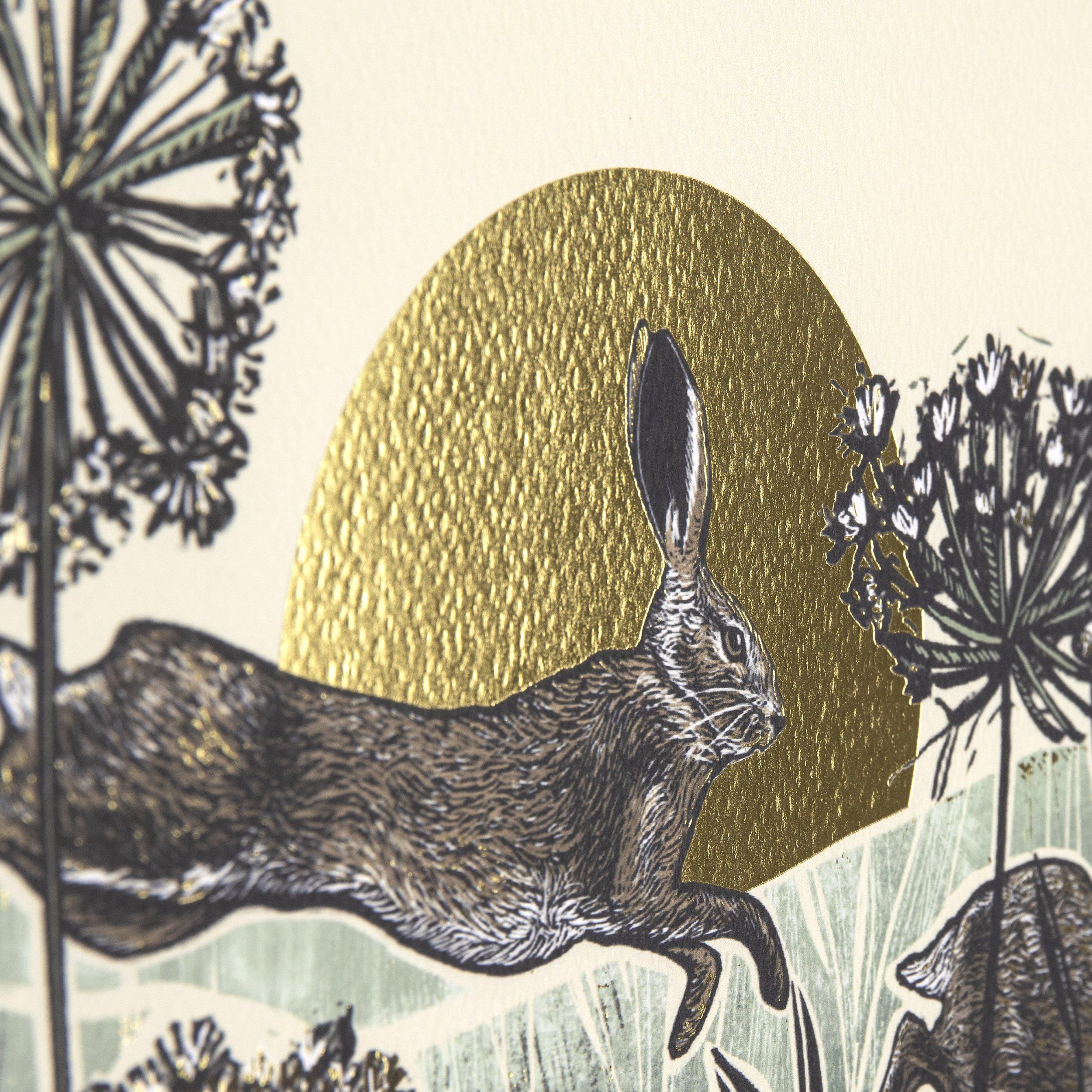 Effortlessly leaping over the ferns and foliage at the meadow’s edge, a pair of mad March hares greet the dawn. The artful use of torn and raised paper, along with gold foil, adds depth, texture, and a heartening warmth.