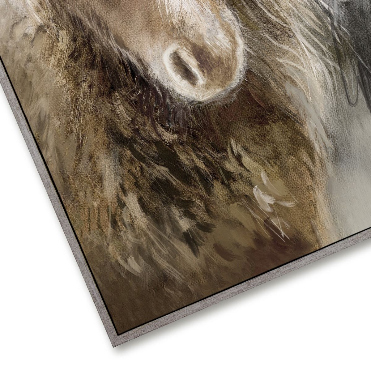 A trio of windswept horses gather, finding solace in one another amidst the bleak weather. Varying in color, Charlotte Oakley’s watercolor print captures a tale of strength and resilience.