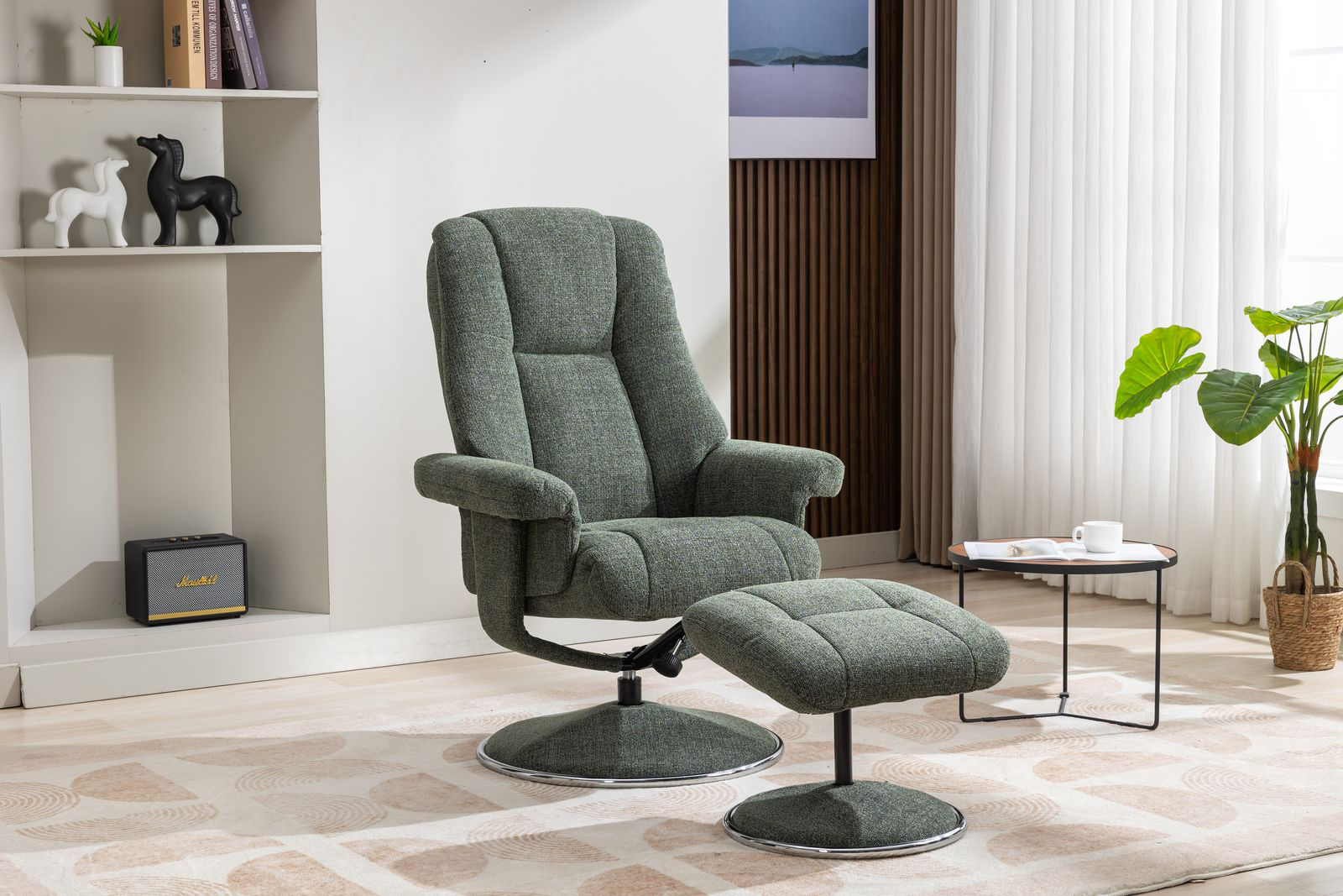 Global Furniture Alliance Denver Chair in Chacha Fern Fabric With its clean lines and contemporary style, the Denver swivel recliner offers sumptuous comfort at a great price! It’s easy twist handle operates the manual recliner and the 360 degree swivel gives the user complete control. With it’s versatile offering of soft touch leather/match and fabric, the Denver will be the perfect addition to any home.