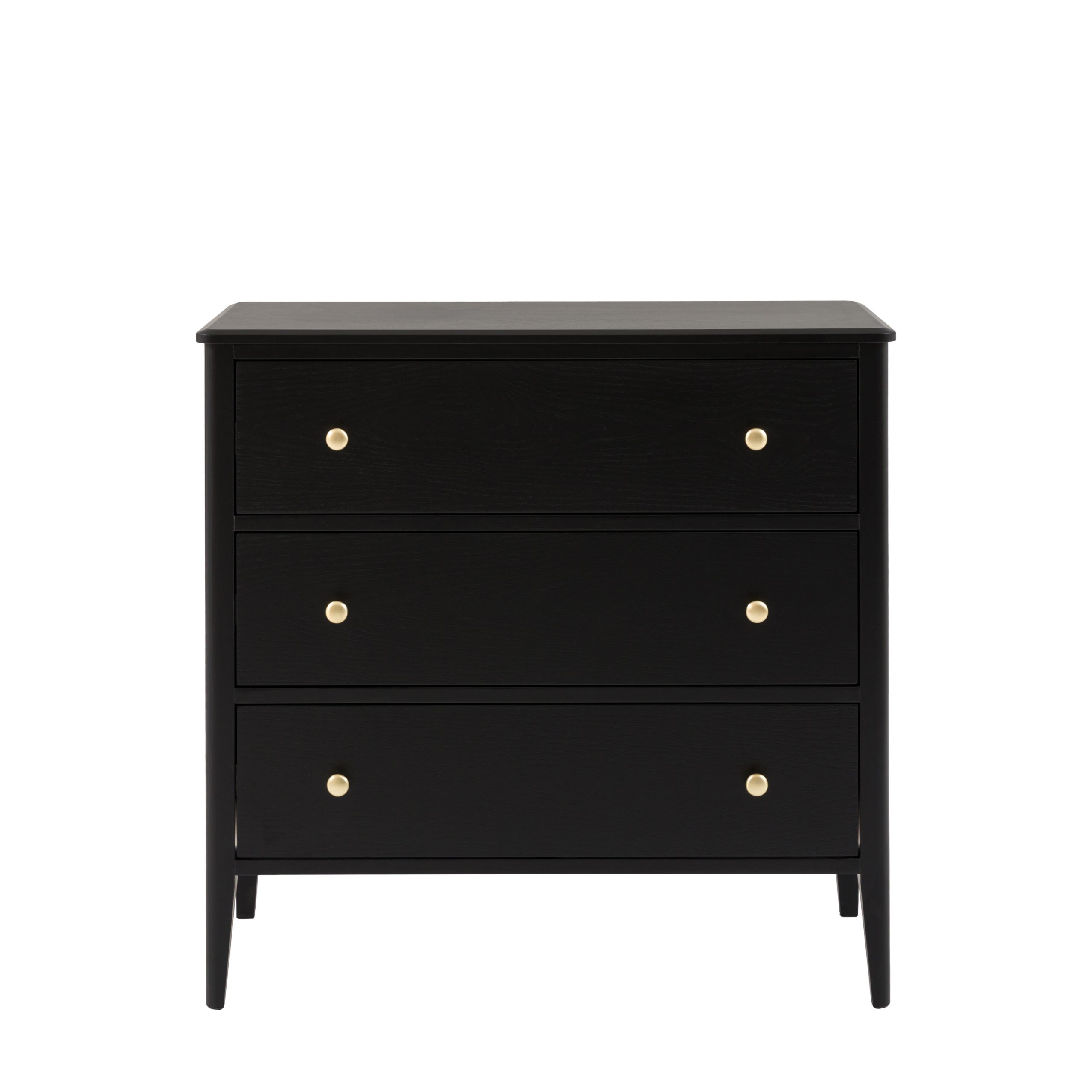 Gallery Direct Acton 3 Drawer Chest Black Organise any space with this elegant 3 drawer chest. Featuring three generous drawers, this chest offers ample storage while adding sophisticated style to a room. The rich black finish is beautifully complemented by gold handles, bringing a touch of modern luxe to a bedroom, dressing room, or living area.