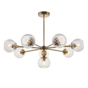 Twisted glass shades give this ceiling light a decorative edge. This 8 light semi flush is perfect for casting light around rooms with low ceilings, finished in a stunning antique brass plate. Matching items also available to complete the look.