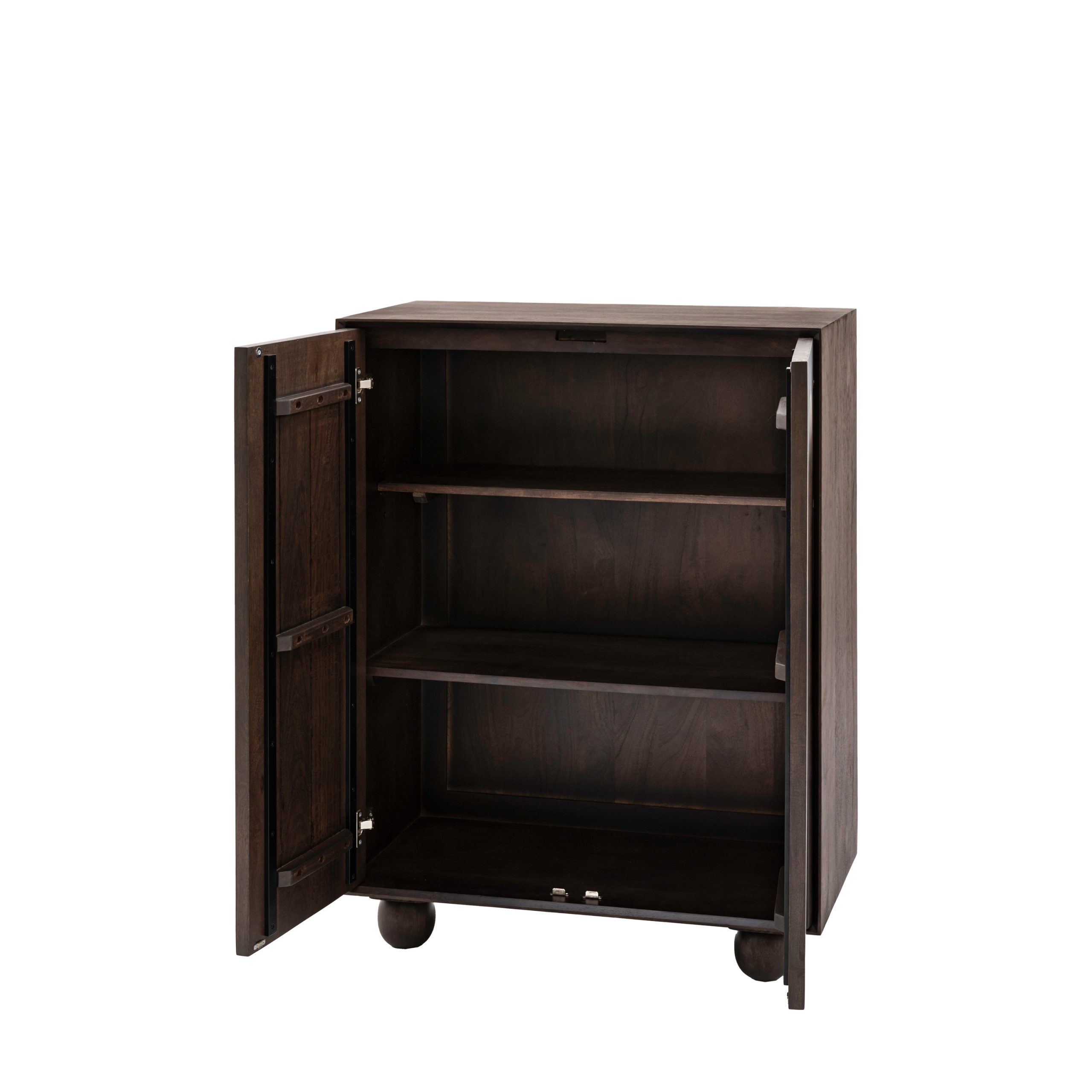 Bring 70s fashion into the present day with this twist on classic retro style. Featuring relief arch patterns and rounded ball feet this 2 door cupboard makes a bold style statement while also being a great storage solution. Made from Mango wood stained to a lovely dark tone to highlight the woods rich grains. Further coordinating pieces also available.