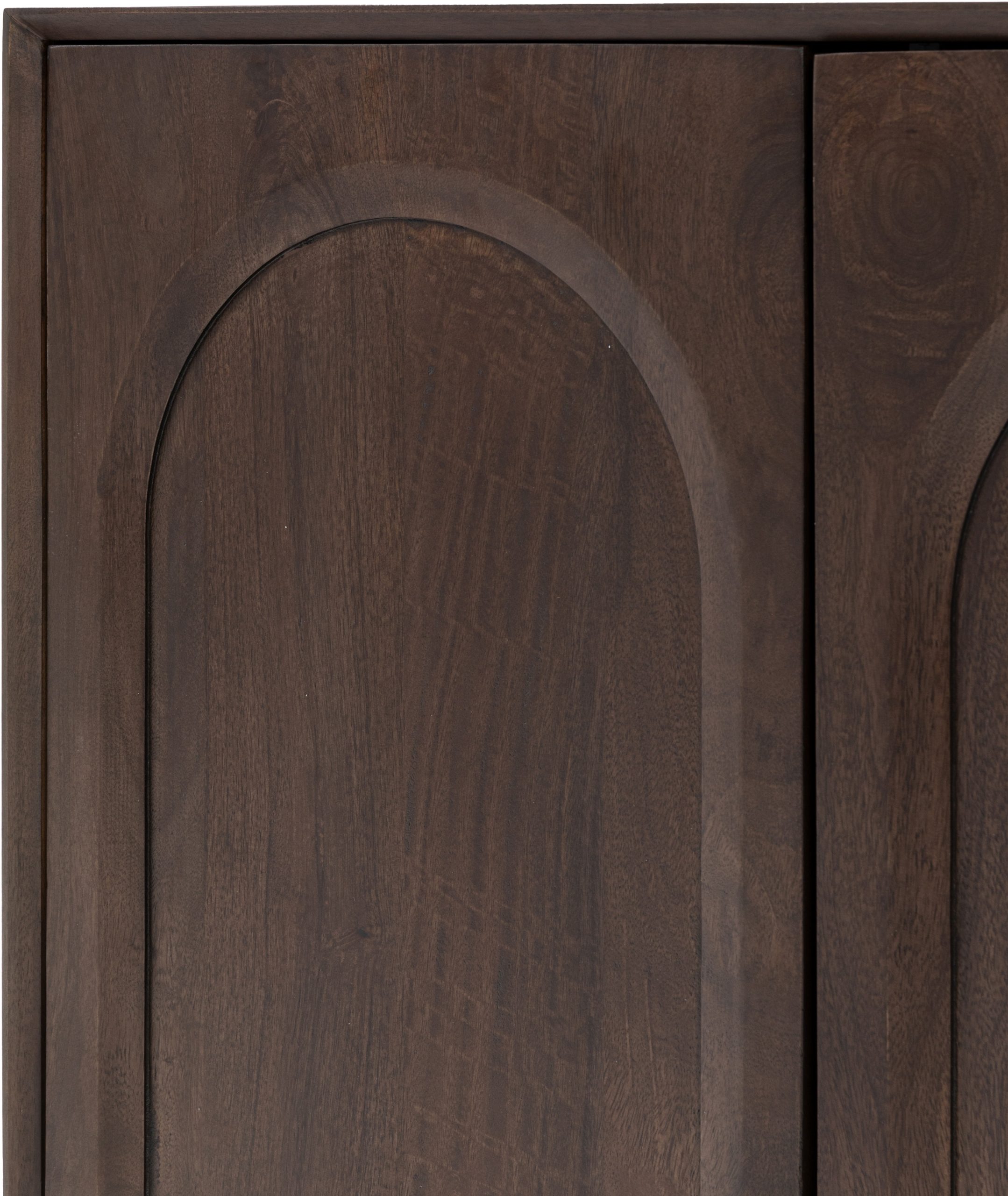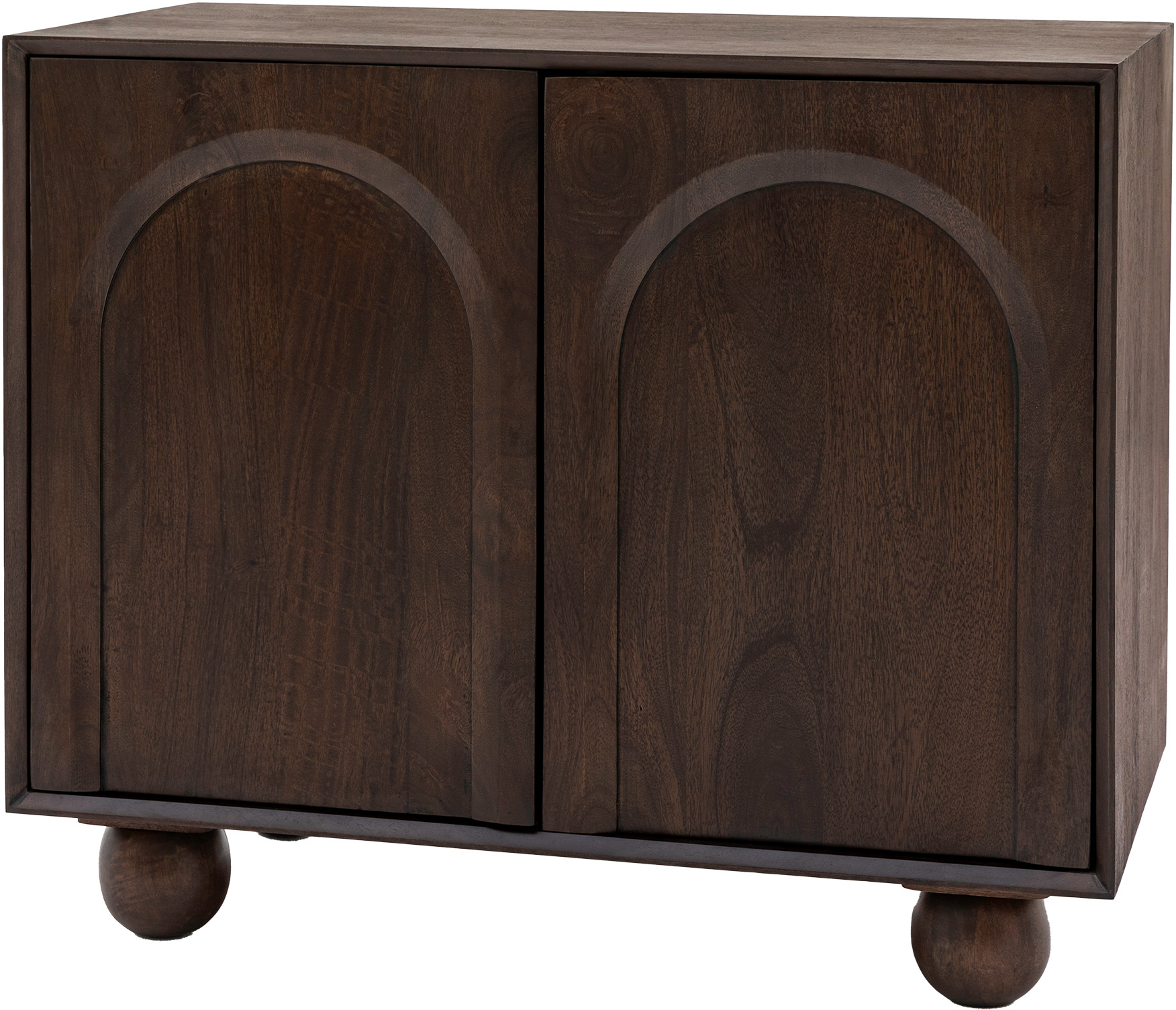 Gallery Direct Arc 2 Door Sideboard With a 70s influence, this sideboard exudes retro cool. The dark stained Mango wood is full of rich grains which is highlighted by the relief arch design in each of the 2 doors. Finished off with rounded ball feet and internal shelves offering plenty of storage this unit is a must have for any trendy home. A 4 door option is also available, as well as further coordinating pieces.