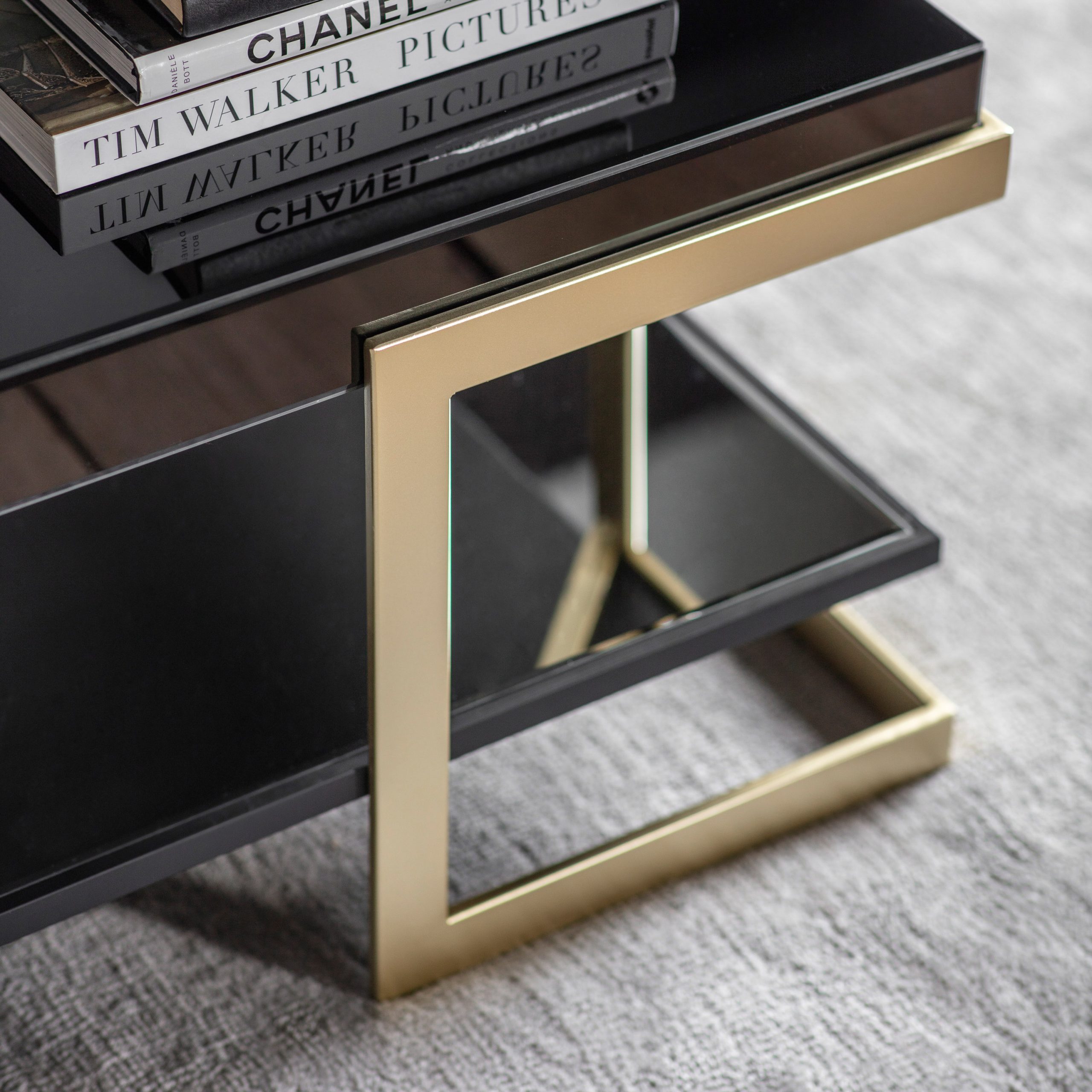 Glamorous and sophisticated, this high design coffee table combines a bold metal base in a soft gold finish with black glass tops and shelves for the ultimate in Luxe living. For even more glamour, pair with the coordinating side and console tables.