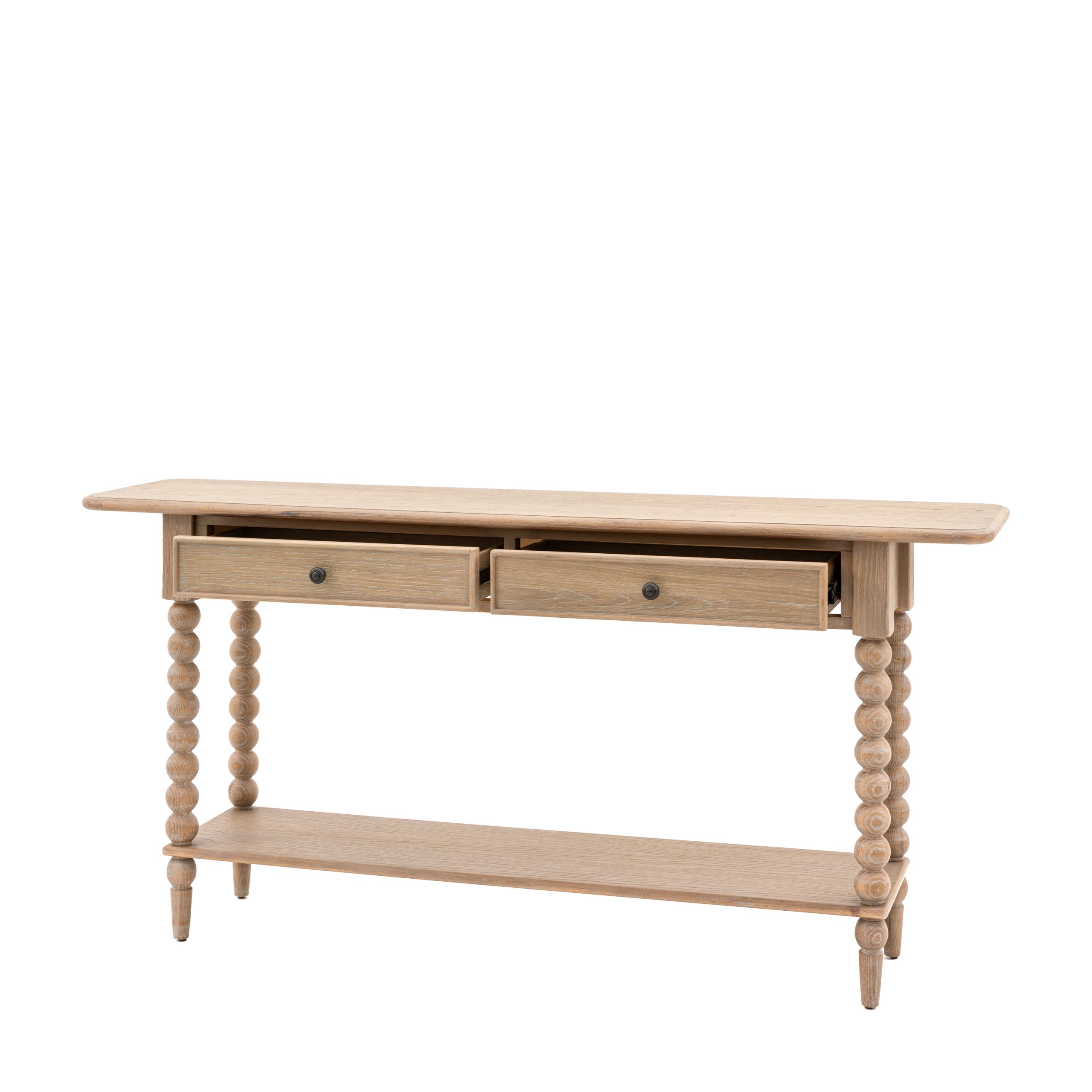 This stunning console table, with its two Drawers and lower shelf for added practicality, would make a stylish addition to any interior. The play on a classic look emphasises the hand-crafted bobbing detail down each leg. This eye-catching design feature is created by turning the wood on a lathe, a task carried out by the finest craftsmen. The table is made using beautiful oak solids and veneers where practical, with a very subtle lime wash tone to the finish which is soft and mellow. Matching pieces are available.