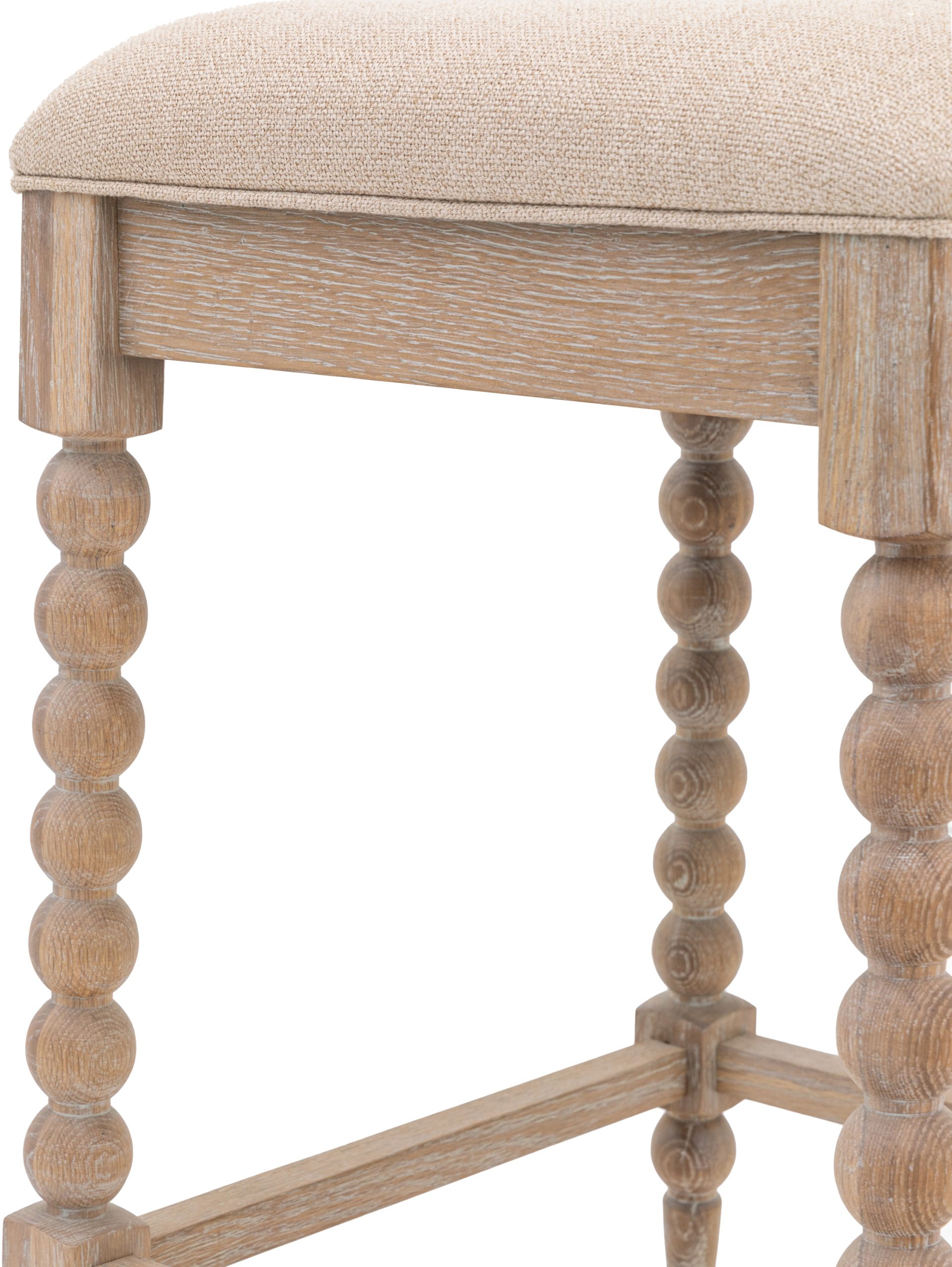 The eye-catching legs on this beautiful bar stool feature hand-crafted bobbin detail which is created by turning the wood on a lathe, a task carried out by the finest craftsmen. The stool is made from oak with a very subtle lime wash tone to the finish which is soft and mellow, paired with biscuit coloured fabric for the upholstered seat. Matching pieces are available.