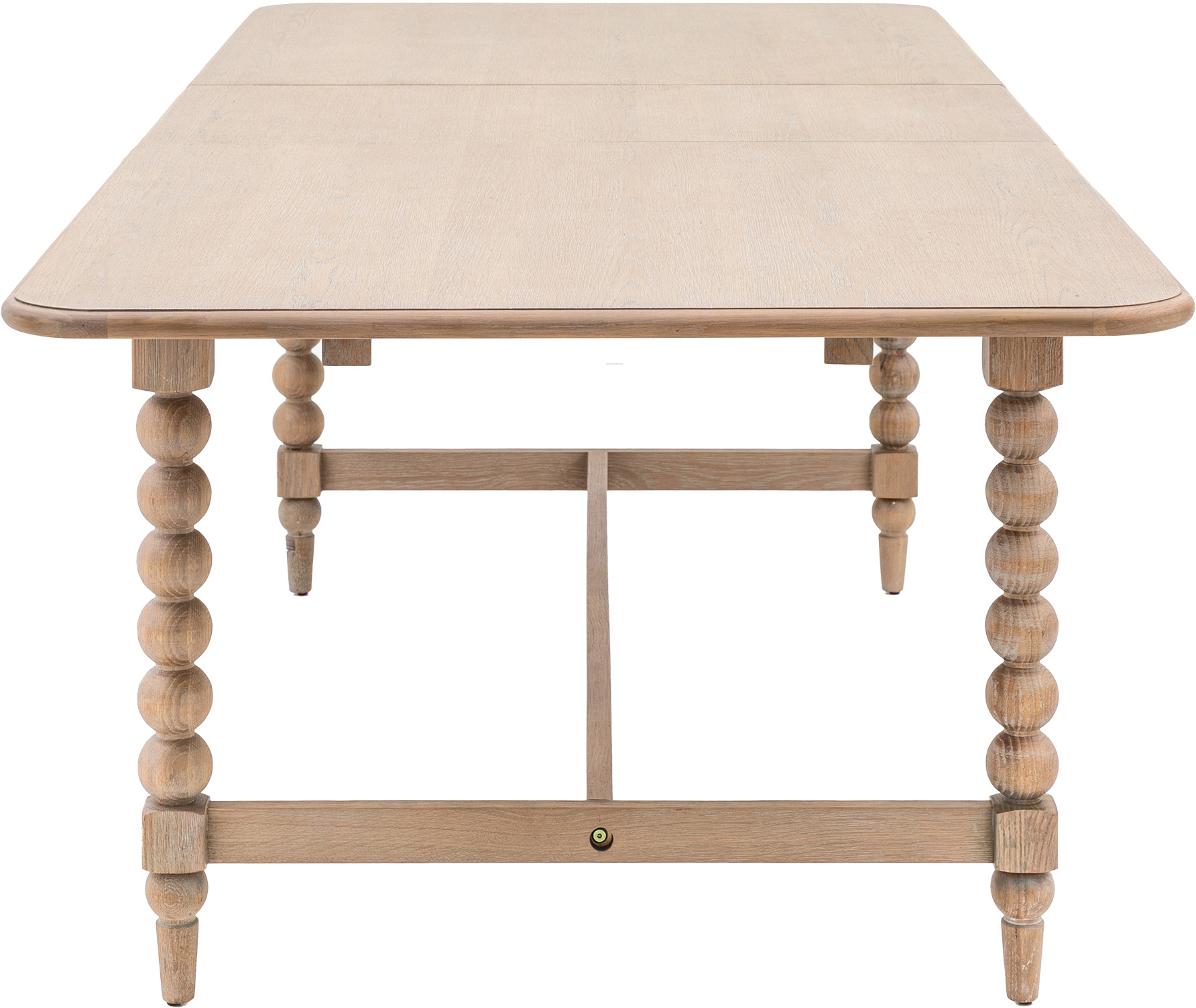 This stunning dining table will make a classy addition to any dining room, and with its extending top it is both beautiful and practical. The legs feature hand-crafted bobbin detail which is created by turning the wood on a lathe, a task carried out by the finest craftsmen. The table is made using beautiful oak solids and veneers where practical, with a very subtle lime wash tone to the finish which is soft and mellow. Matching pieces are available.