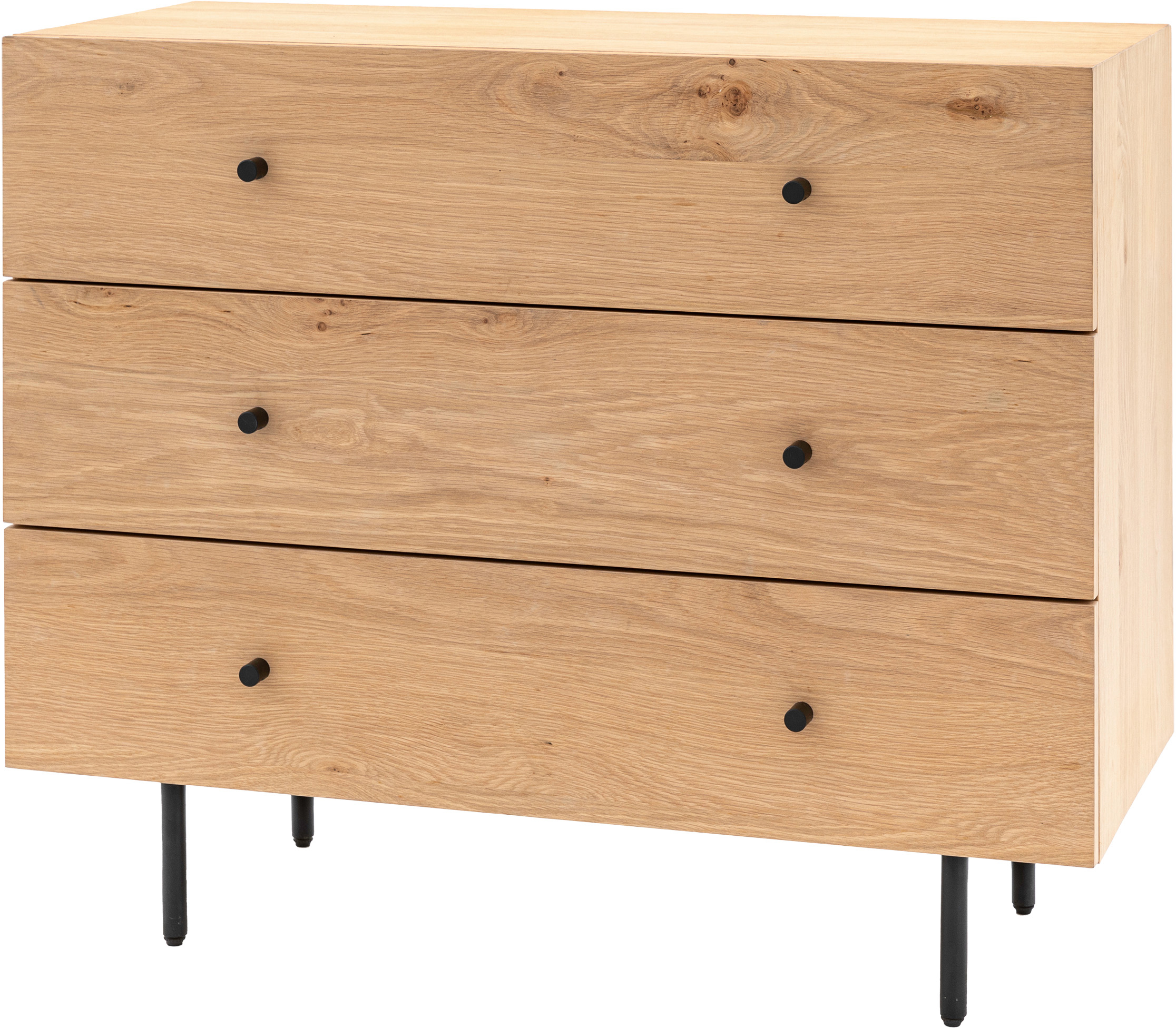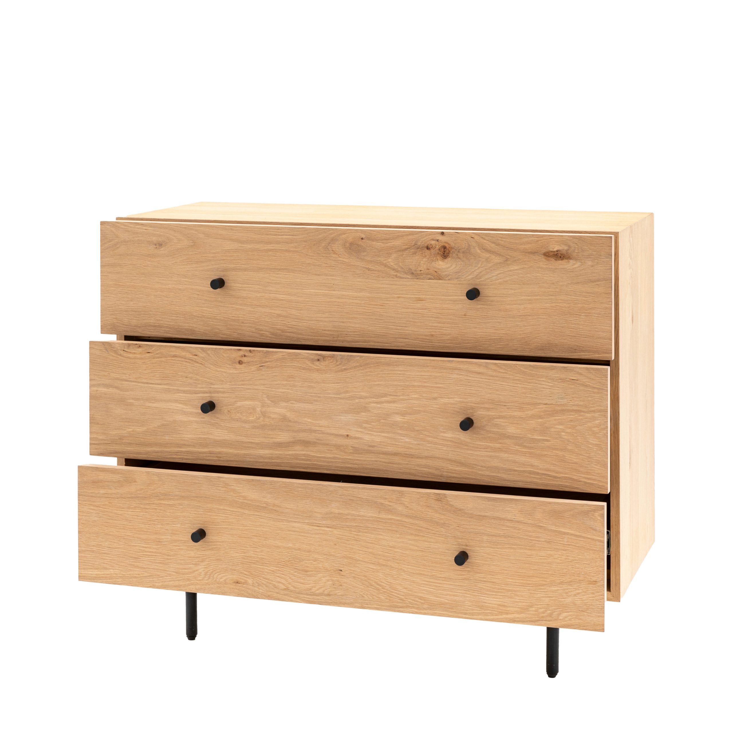 Offering a lovely contemporary look, this practical chest of drawers is crafted using oak veneers paired with a black metal underframe and drawer handles. The natural wood veneer, with its unique random knots, has been selected to give a modern rustic style. Matching pieces available.