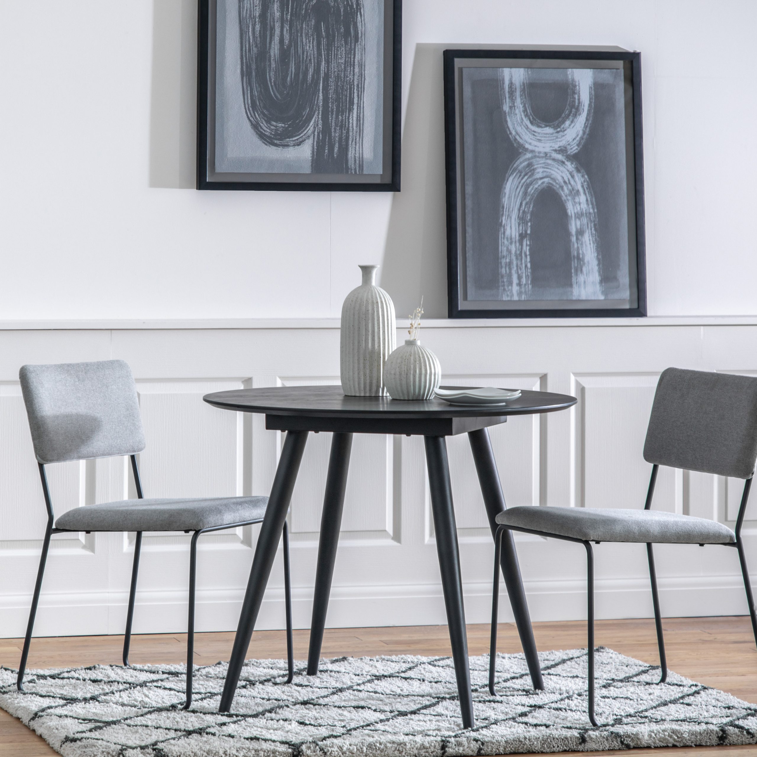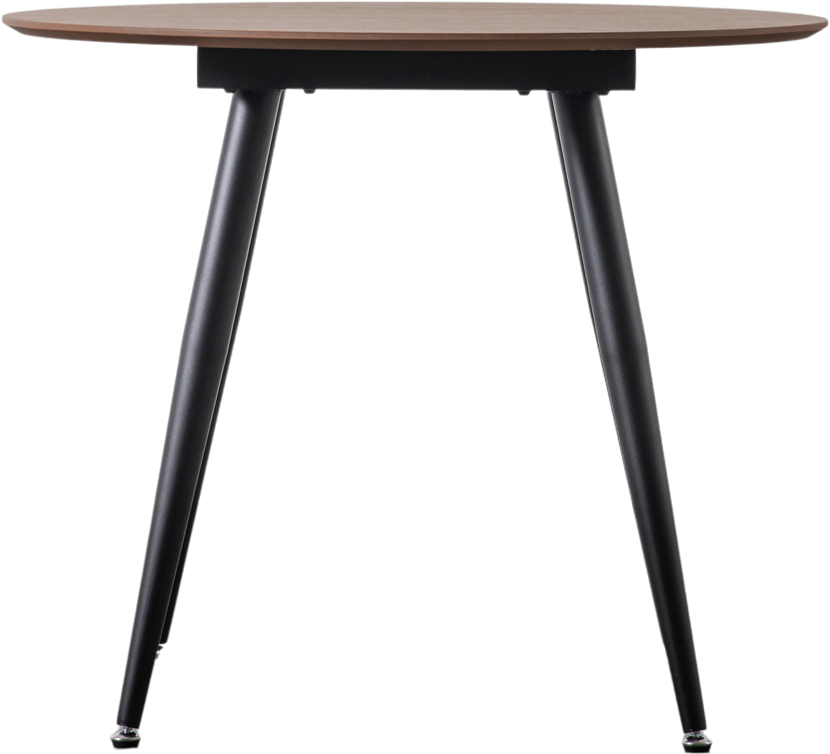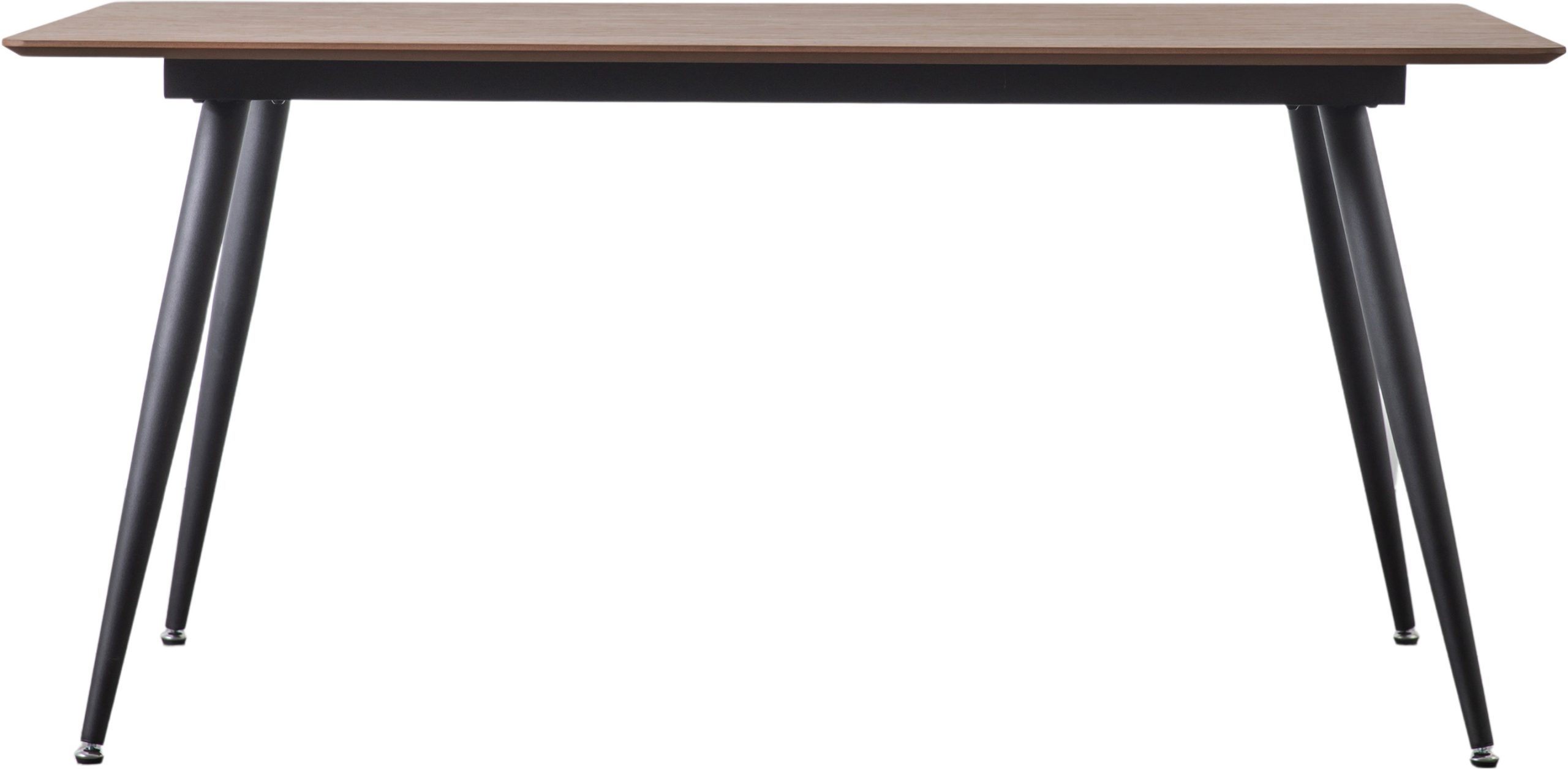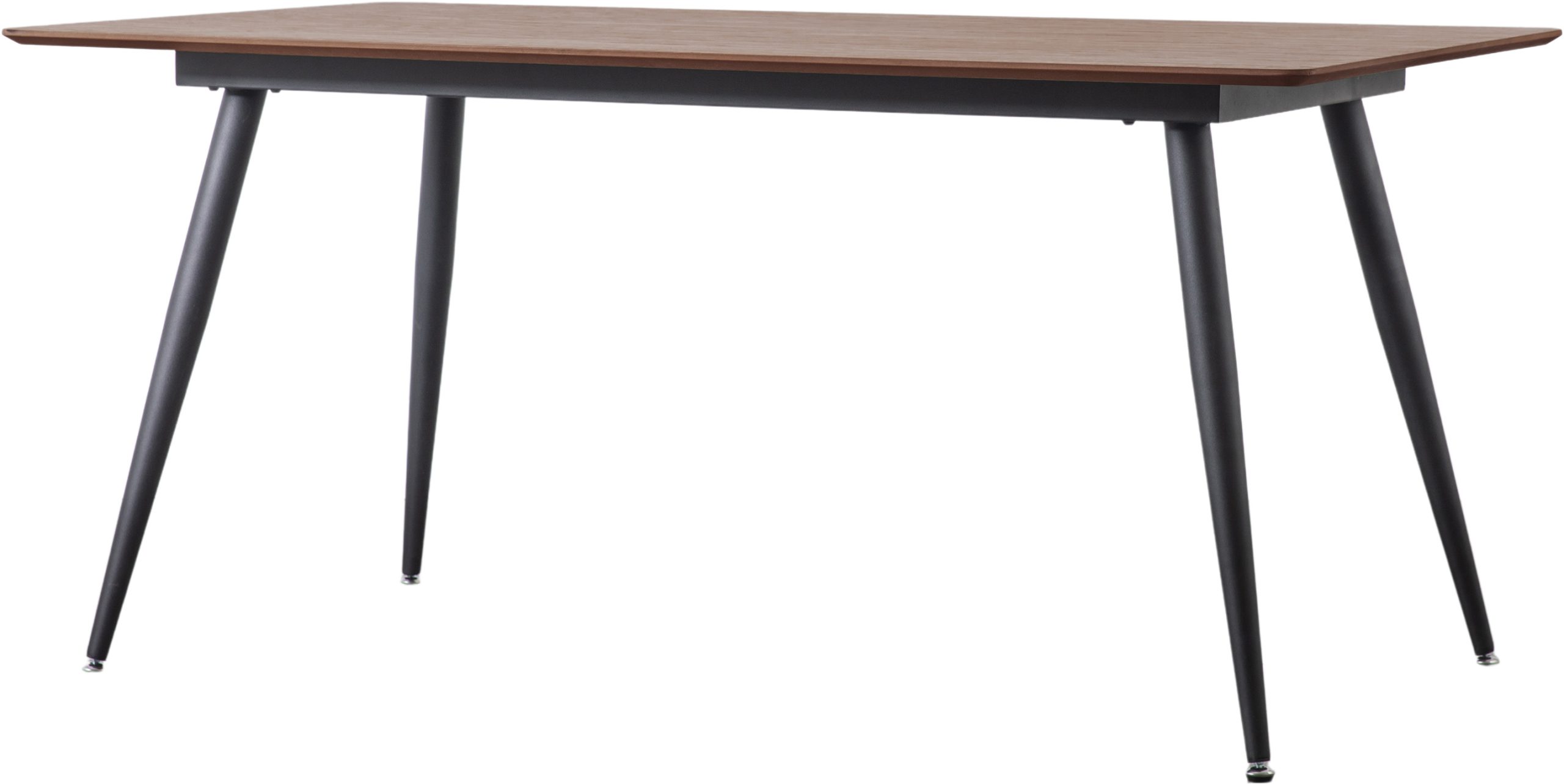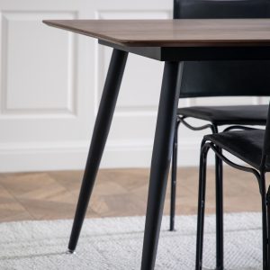 Gallery Direct Astley Dining Table Walnut This stunning dining table offers a sleek contemporary look, combining a walnut veneer top with elegant black metal legs, whilst chrome feet add the finishing design detail. It is part of our Packed-Flat Design Project which offers easy delivery to any room in any property and reduces the packaging needed. Assembly is required, but all the tools needed are supplied. The table is part of a collection offering a selection of six dining tables, with a choice of a round or a rectangular style, each in three top finishes, black oak, natural oak, and walnut.