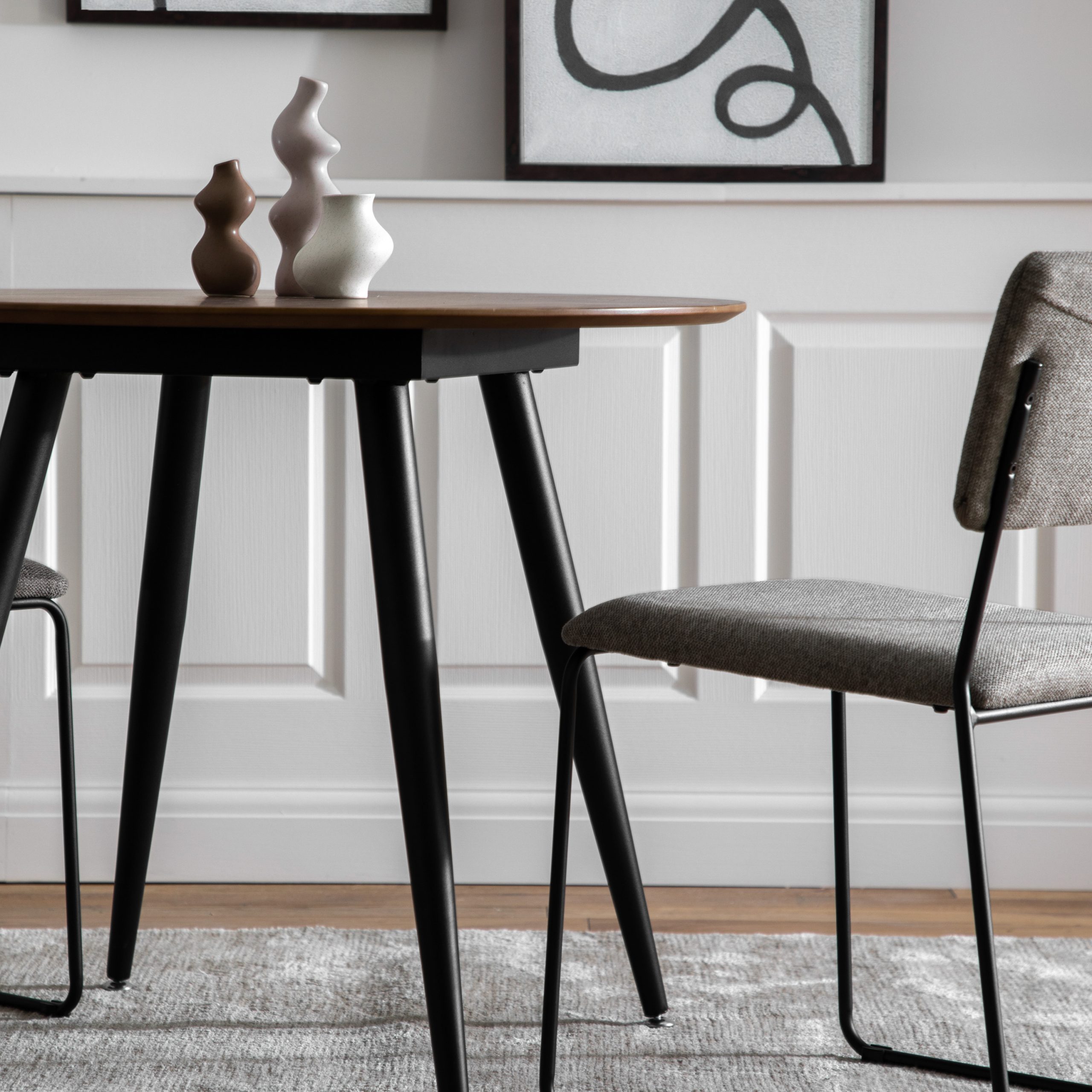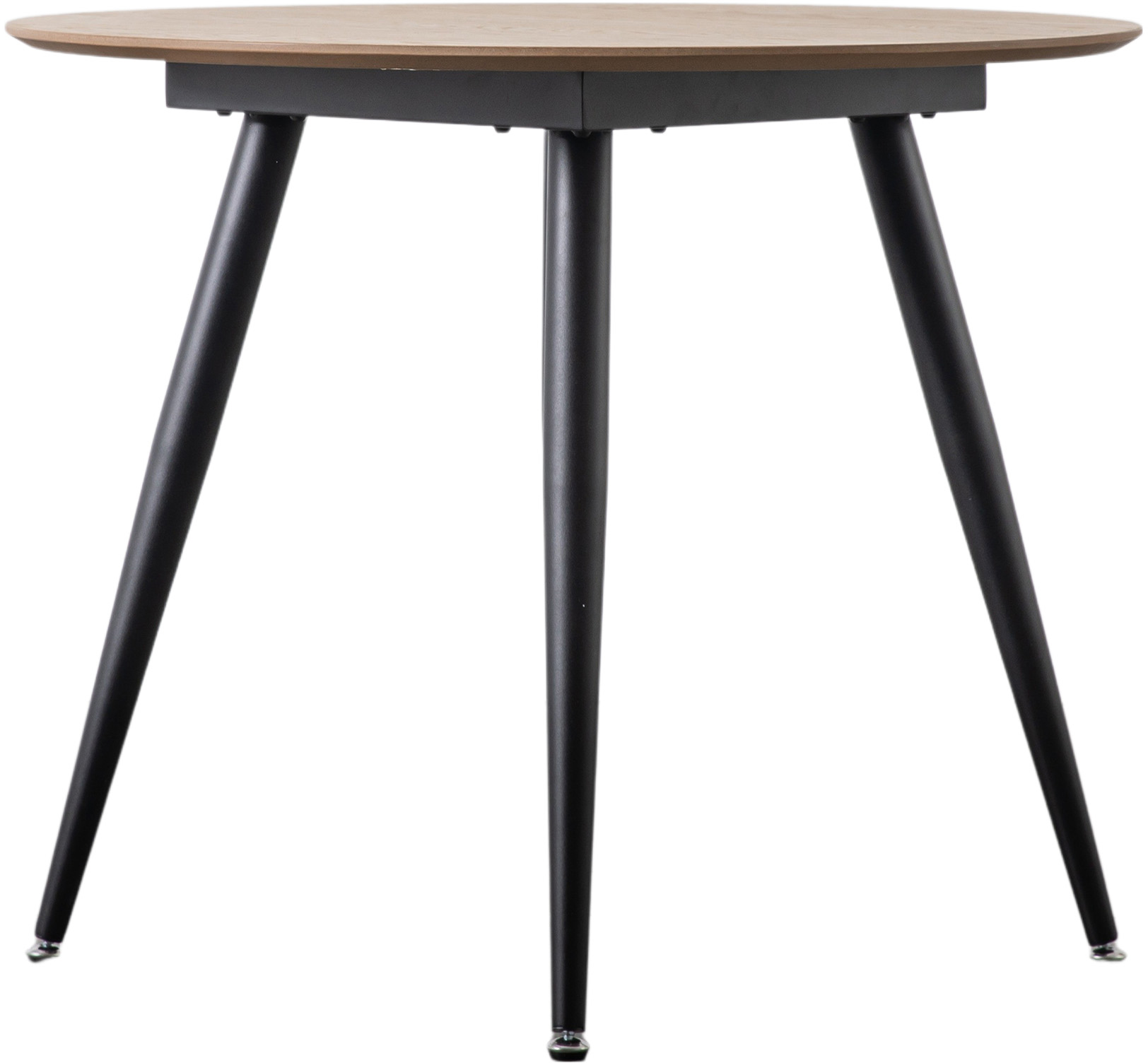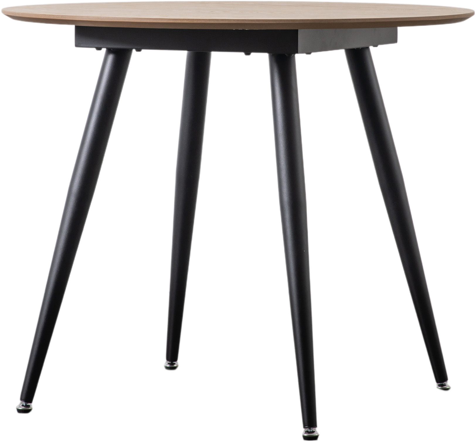 Gallery Direct Astley Round Dining Table Oak This stunning dining table offers a sleek contemporary look, combining an oak veneer top with elegant black metal legs, whilst chrome feet add the finishing design detail. It is part of our Packed-Flat Design Project which offers easy delivery to any room in any property and reduces the packaging needed. Assembly is required, but all the tools needed are supplied. The table is part of a collection offering a selection of six dining tables, with a choice of a round or a rectangular style, each in three top finishes, black oak, natural oak, and walnut.