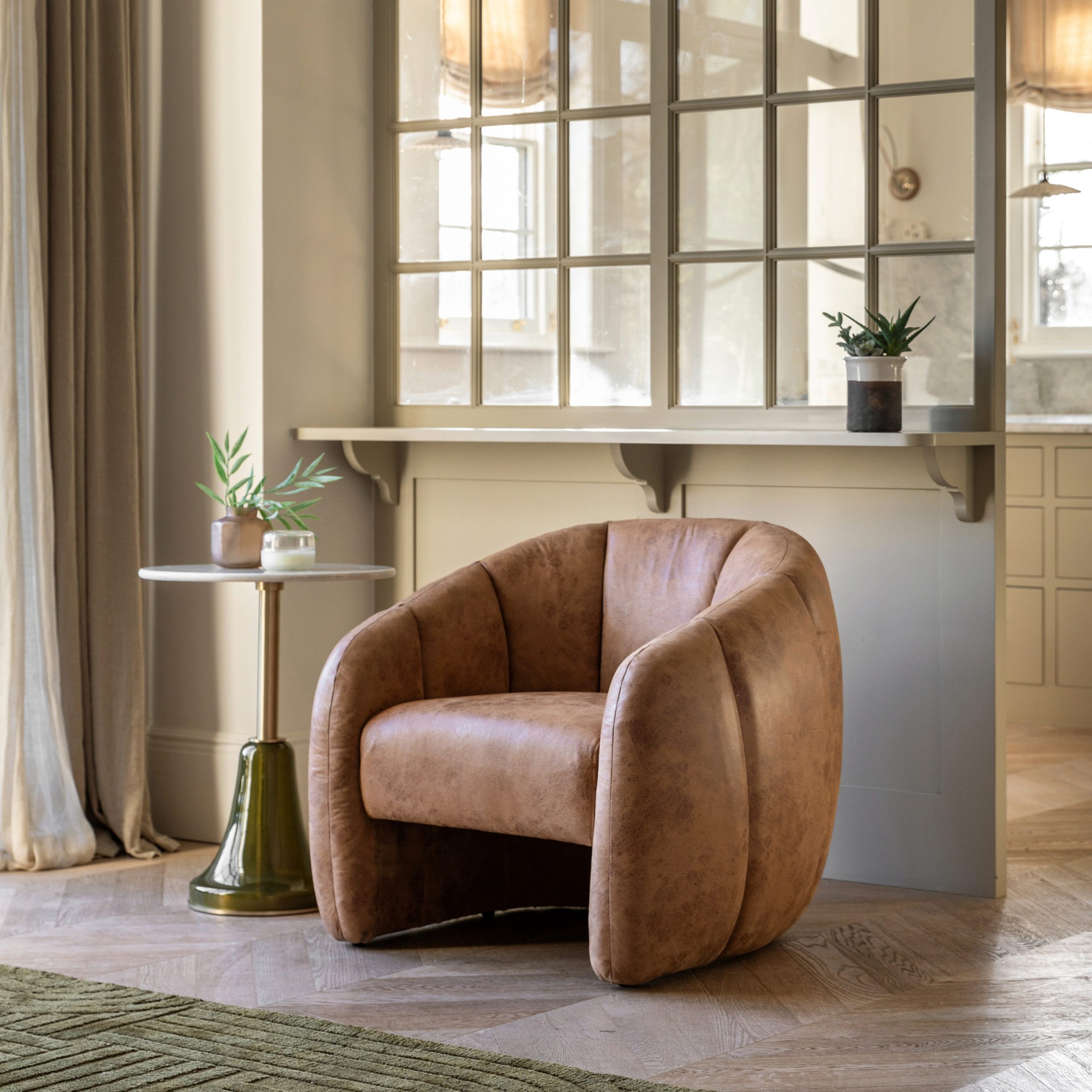 Add a stylish design piece to a room with this stunning tub chair. Fully upholstered in tan leather with vertical stitching to add an extra design detail, the chair would look at home in a wide range of rooms.