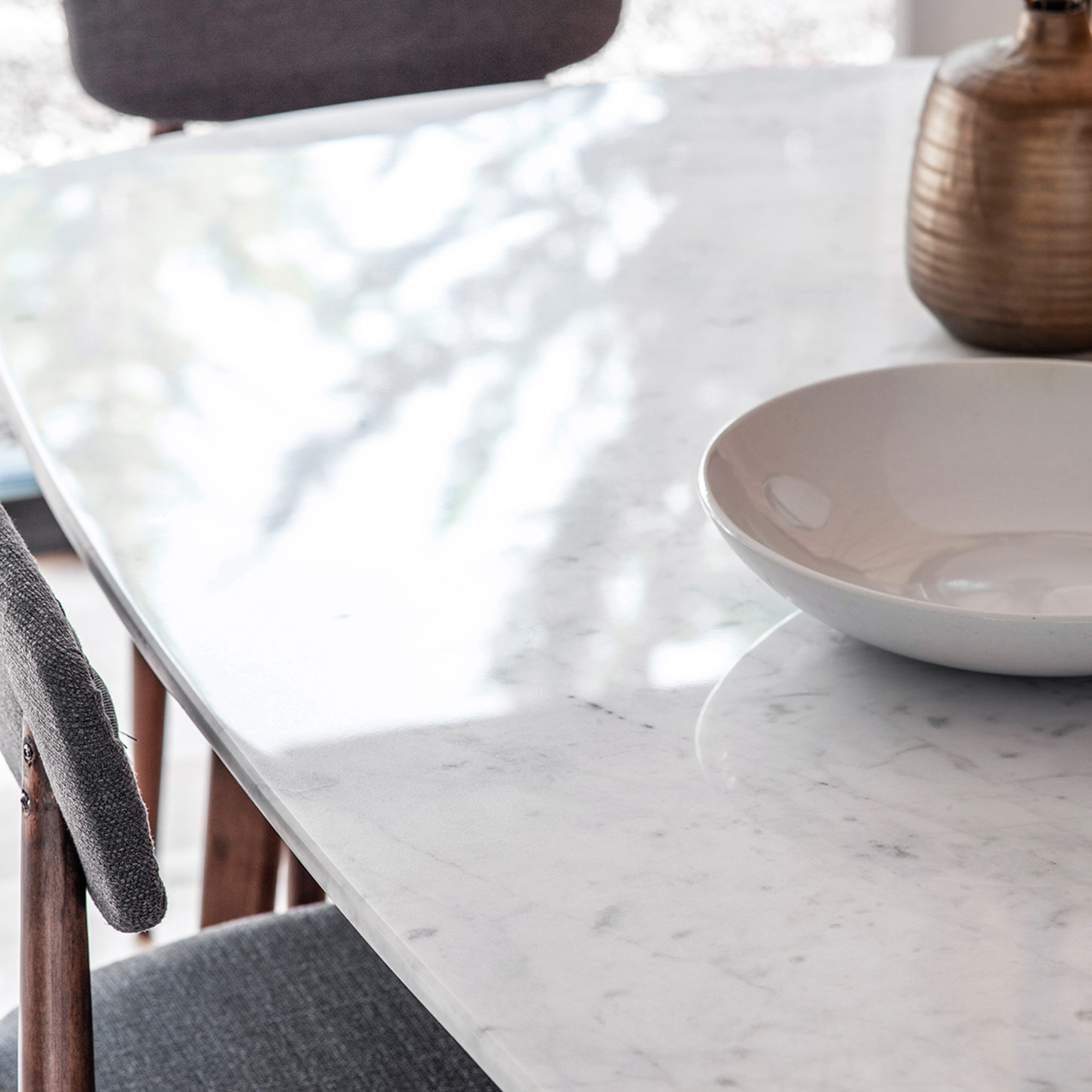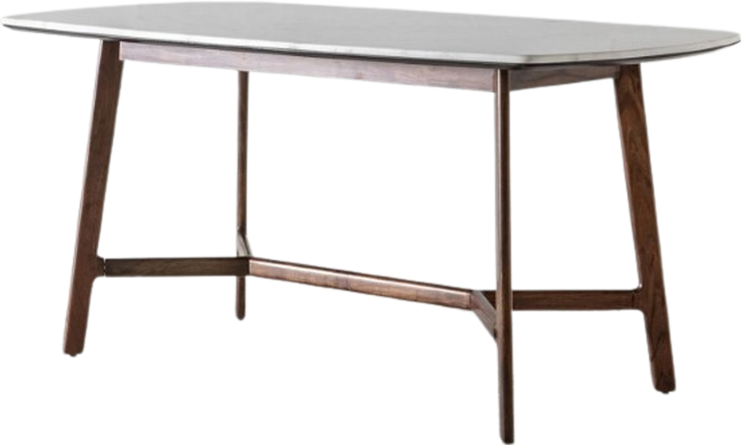 With retro mid century inspired lines this rectangular dining table features a coach end marble top and dark wood legs . The KD base enables easy access into the home and a MDF base secures to the marble for extra strength and stability. Comfortably seats 6.