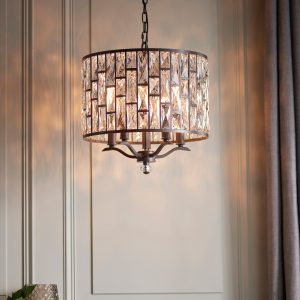 This stunning 5 light pendant mixes high quality faceted glass crystals, arranged in a striking tiered pattern, with an understated dark bronze effect finish. Once lit each crystal combines to create an intense light effect, perfect for timeless classic interiors.