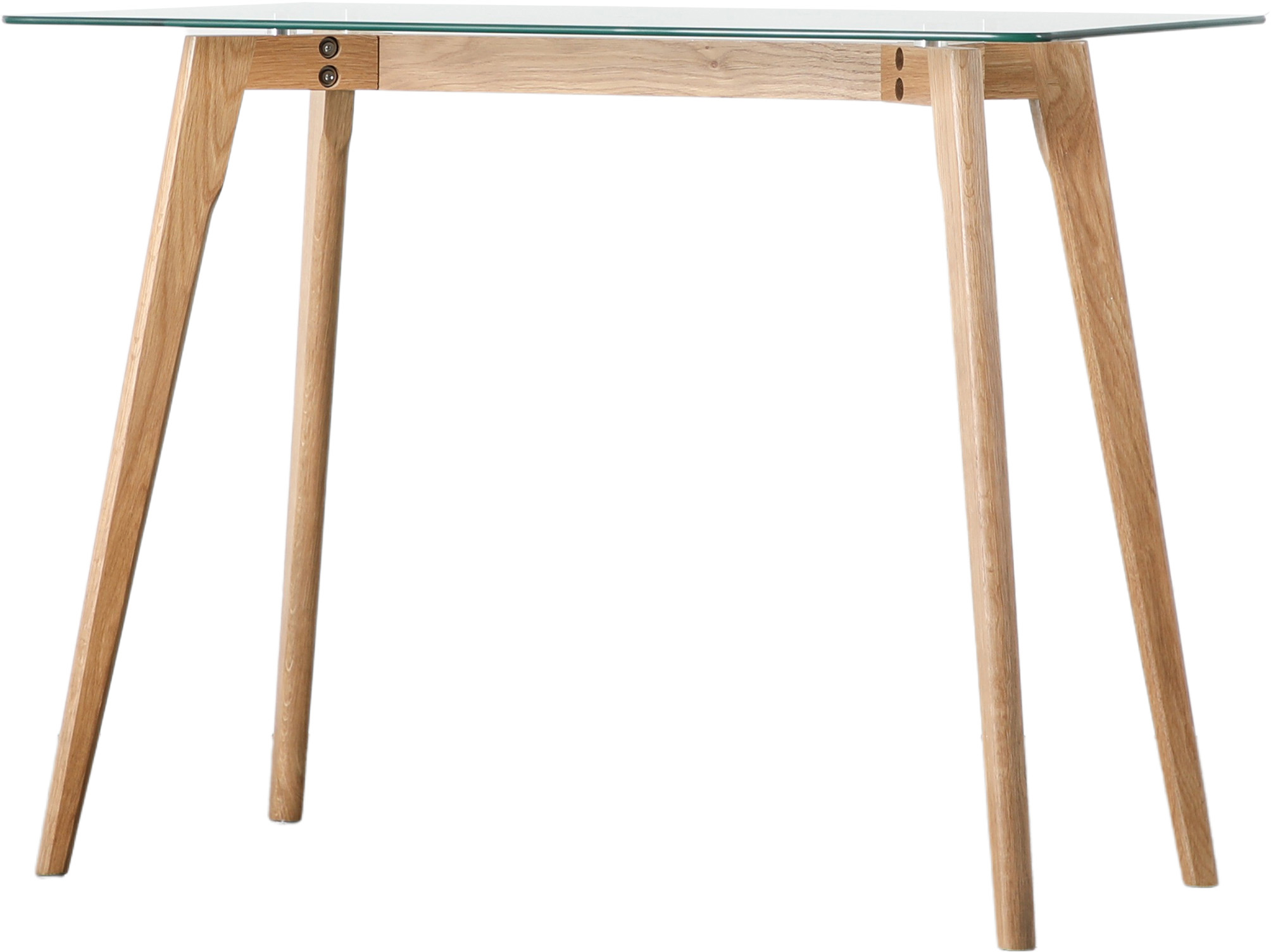 Gallery Direct Blair Console Table Oak This lovely console table features a beautifully designed solid natural oak base combined with a clear tempered glass top to give a stunning contemporary look. It is part of a collection offering a range of tables, in the natural oak bases paired with clear glass and also with black oak and smoked glass.The tables are part of our Packed-Flat Design Project, offering easy delivery to any room in any property, whilst reducing the packaging needed. Assembly is required, but all the tools needed are supplied.