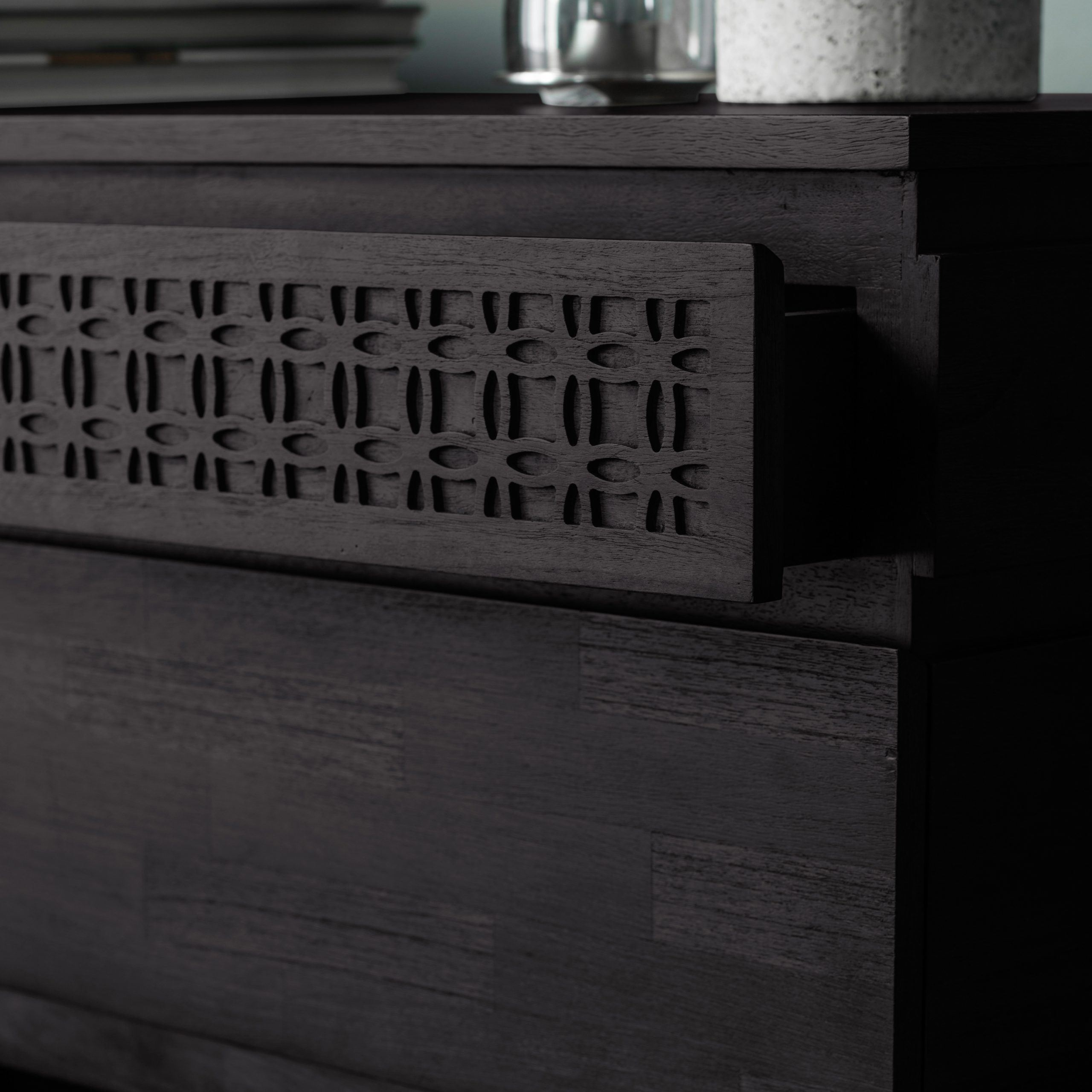 This 4 Drawer Chest is made using Mango solids with mixed timber veneers of Teak-Mahogany-Mindy Ash and Mango which give contrast and make the inlaid pattern stand out. It has a stunning mat black charcoal finish – the different grains in the mixed timbers stand out in the light and catch your eye with this beautiful detail.