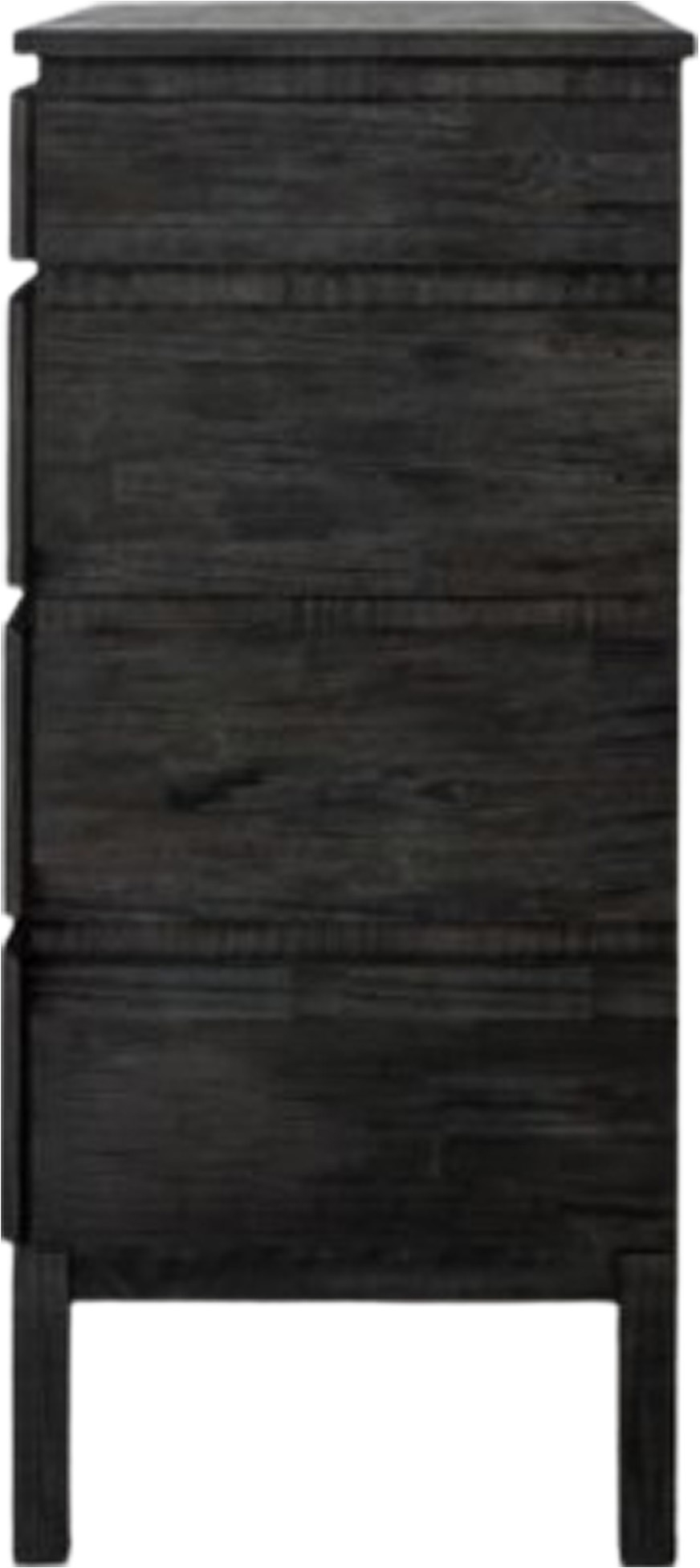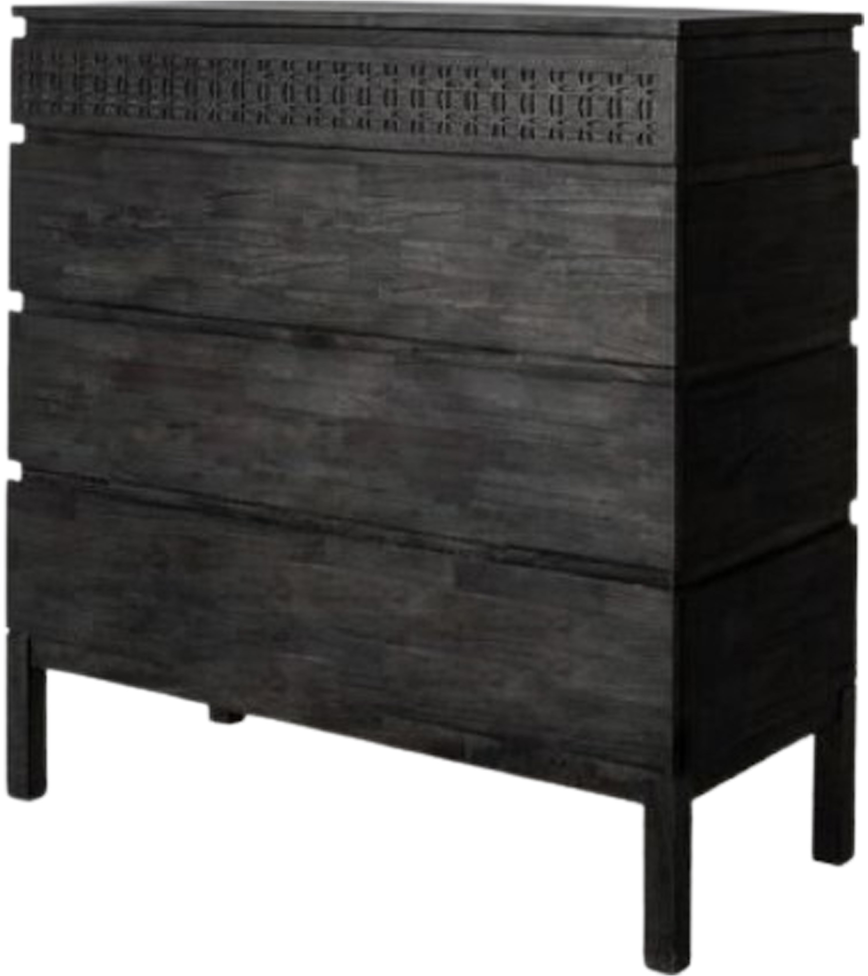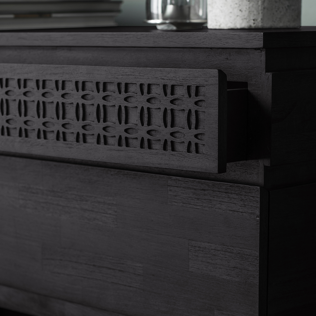 Gallery Direct Boho Boutique 4 Drawer Chest This 4 Drawer Chest is made using Mango solids with mixed timber veneers of Teak-Mahogany-Mindy Ash and Mango which give contrast and make the inlaid pattern stand out. It has a stunning mat black charcoal finish – the different grains in the mixed timbers stand out in the light and catch your eye with this beautiful detail.The chest features a patterned frieze of blind fret work along the front of the top Drawer, made from solid mango wood.Offering a global traveller look that has a hint of ethnic design detail, this beautiful chest of Drawers is exciting but timeless in its approach and so can be mixed with modern or classic pieces in an eclectic living space.