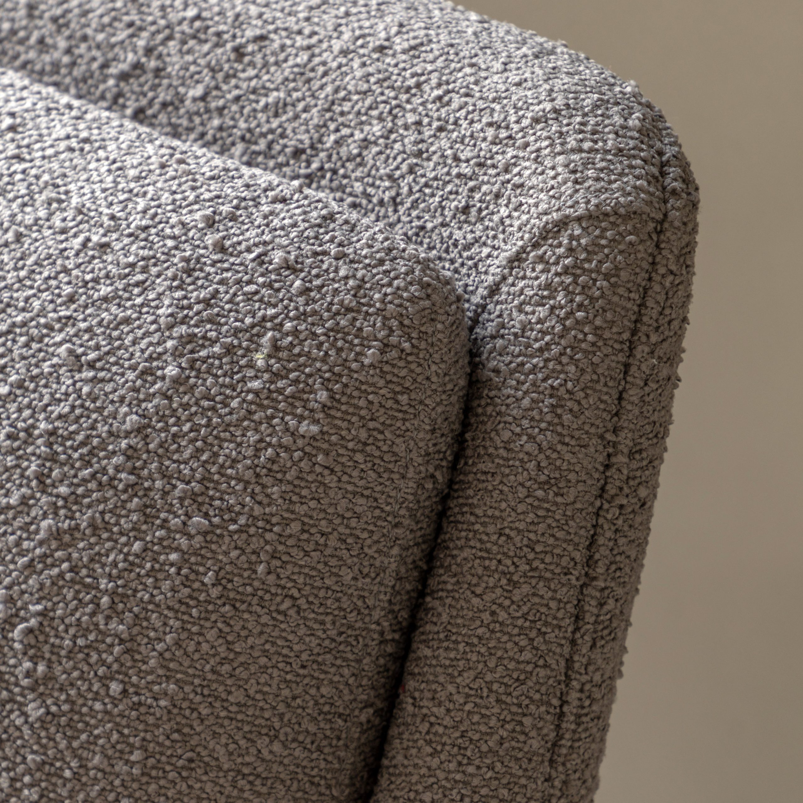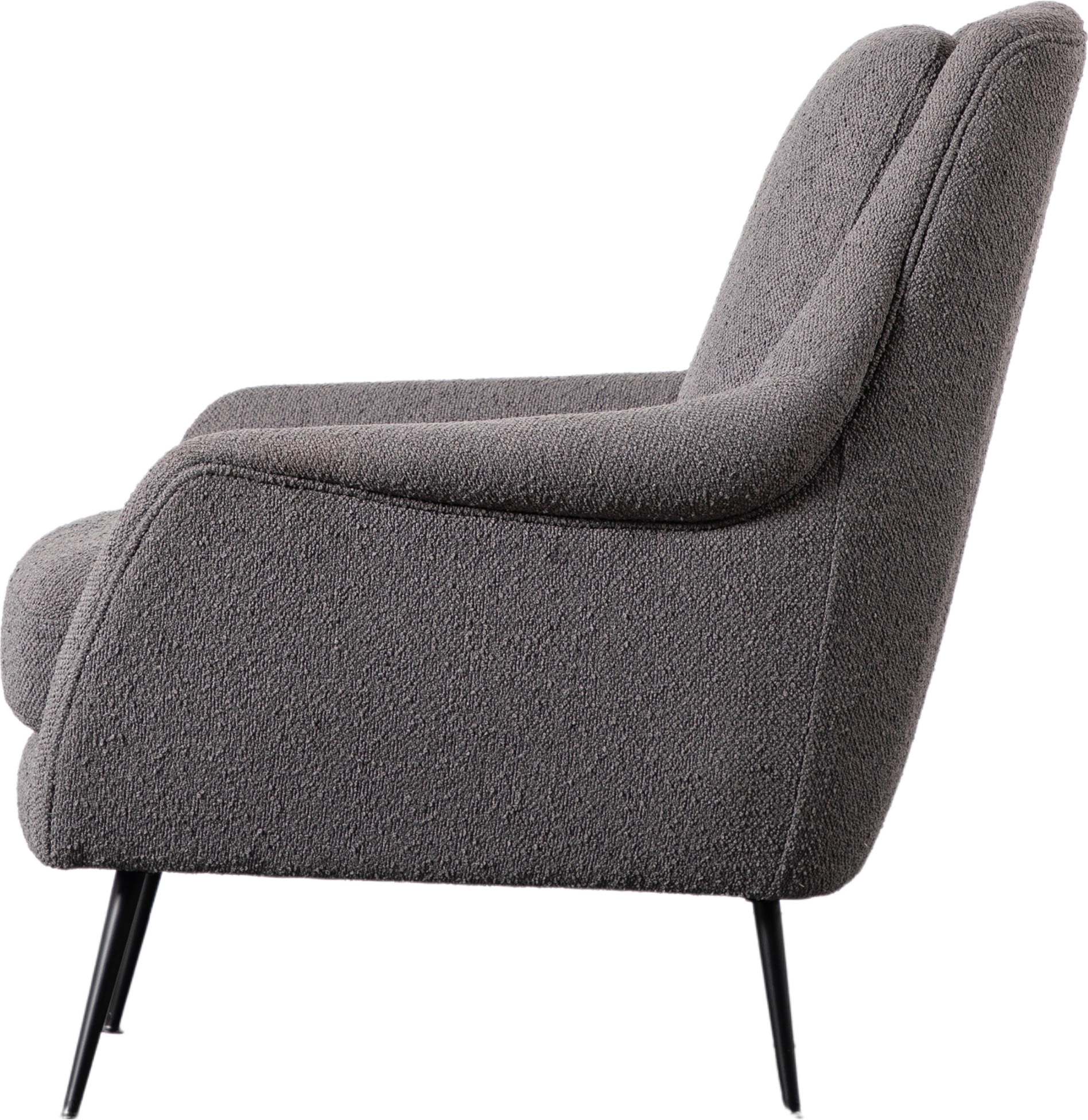 Grey linen armchair offering a retro feel, with a contemporary twist. The chair surround is fully upholstered with an upholstered fixed back cushion and loose seat cushion. Slim matt black metal legs complete the look. The Brompton is also available upholstered in brown leather.