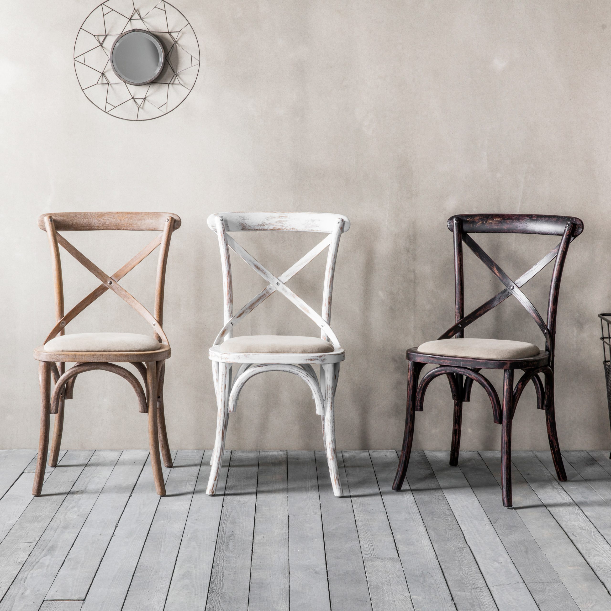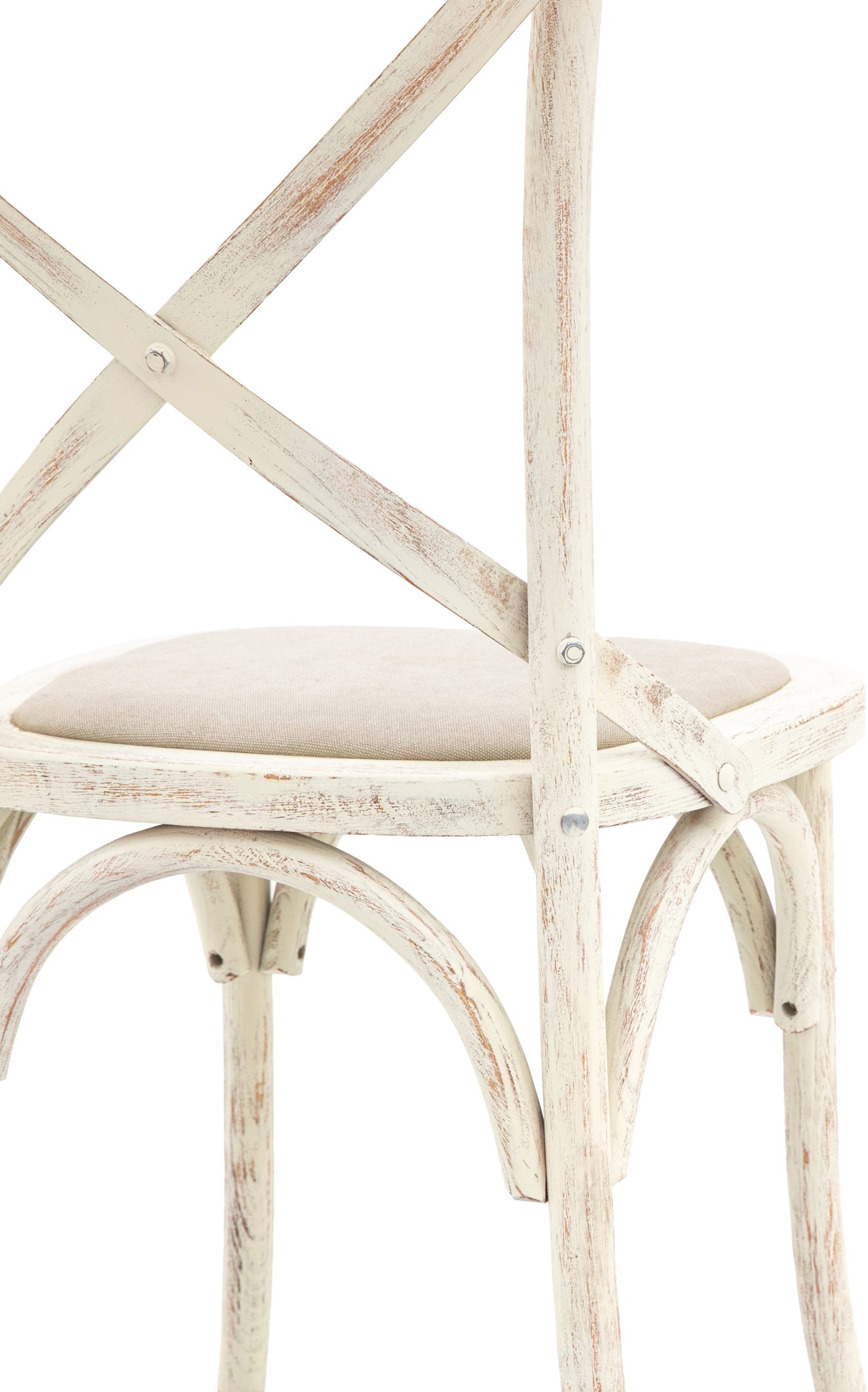 A pack of 2 understated cross back chairs in a distressed white wood finish with canvas seat pads. Ideal for casual dining creating a relaxed French café feel in the home.