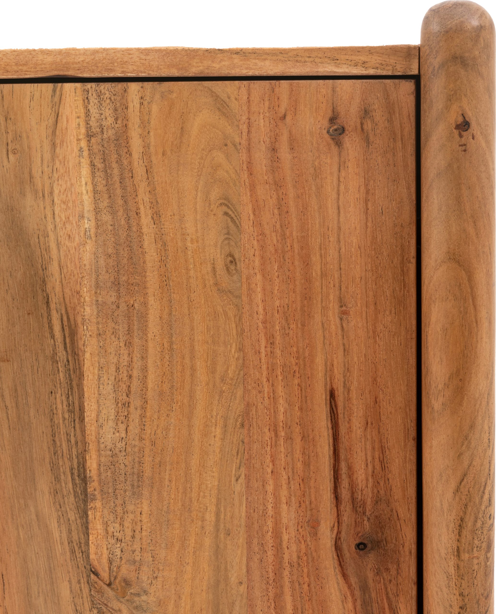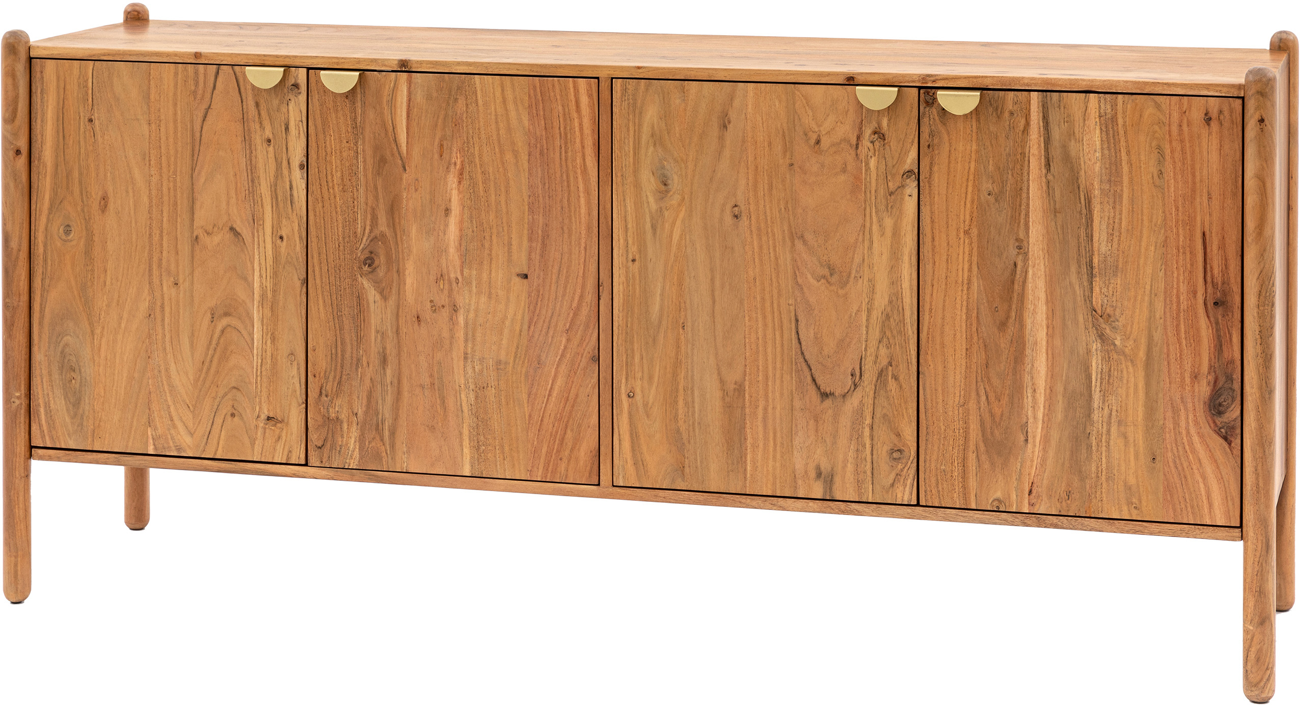 Crafted from rich Mango wood this 4 door sideboard combines style and practical storage all in one. With a retro design influence and slim rounded legs, the sideboard is finished off with small half moon gold toned metal handles. Coordinating pieces also available.