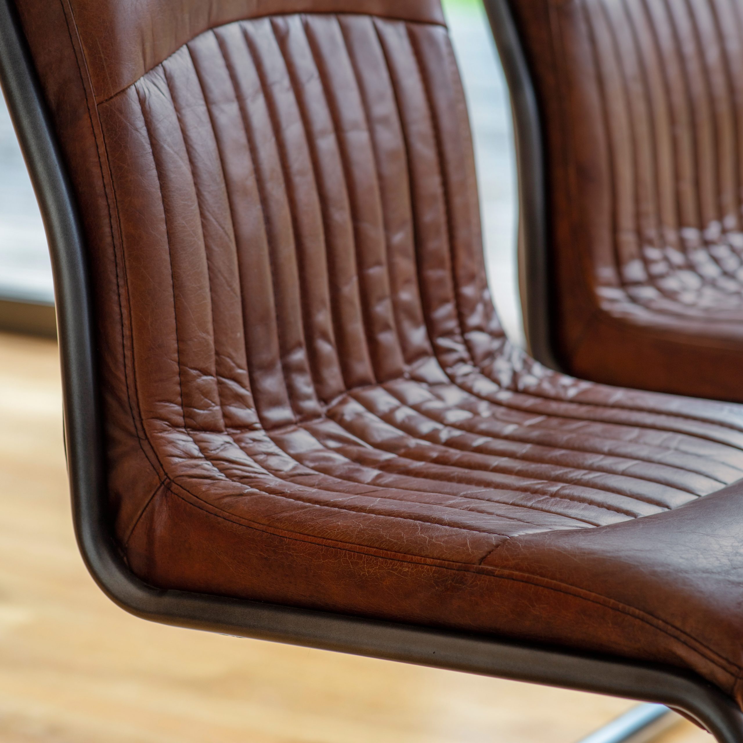 Contemporary dining or office chair with metal frame and top grain leather upholstery.