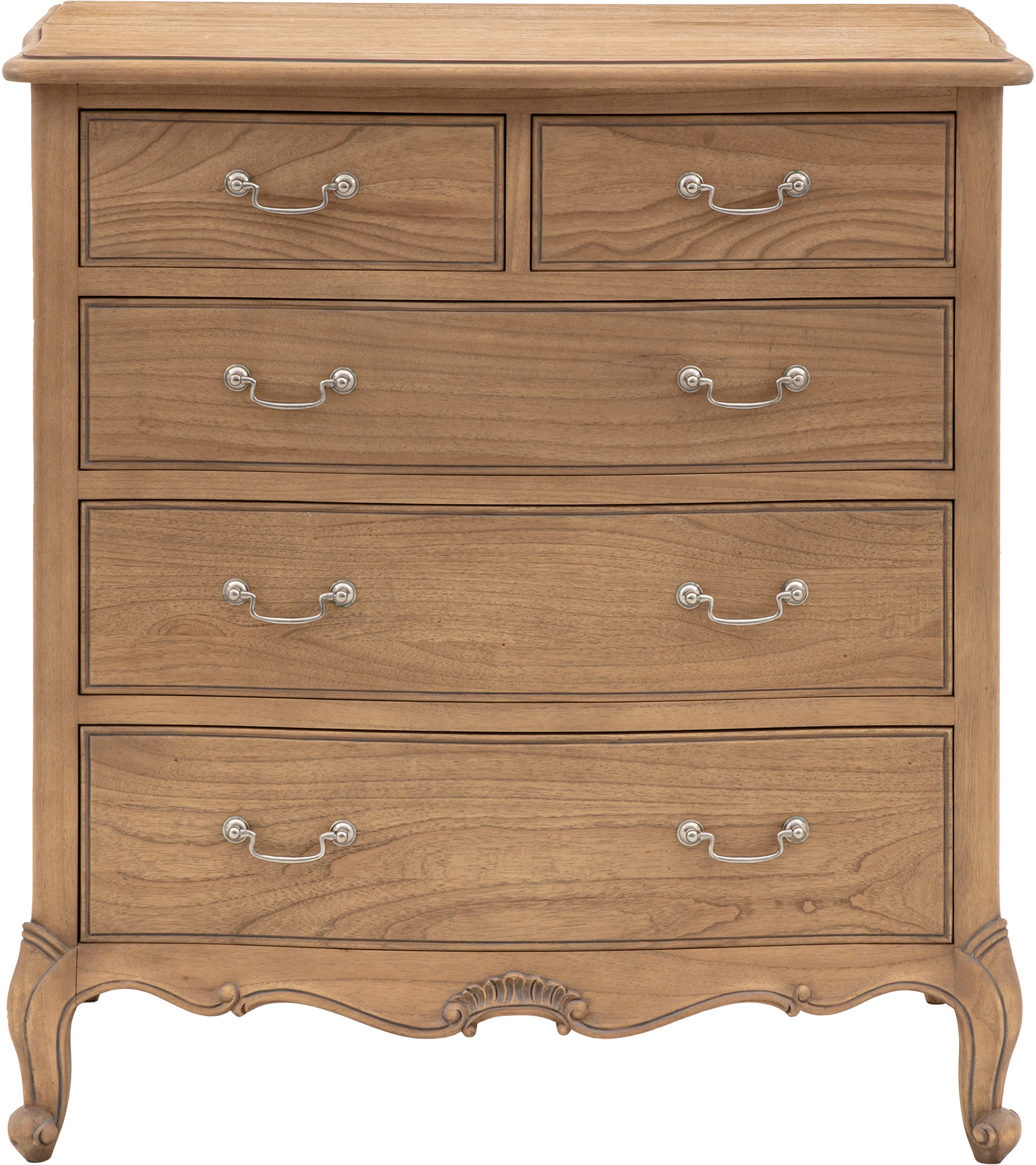 Gallery Direct Chic 5 Drawer Chest Weathered Heavily influenced by traditional French furniture designs, this range exudes style and quality. Available in three different finishes – Chalk, Weathered or Silver. Featuring beautiful dovetailed joints and hand carved sections yet retaining a delicate and fine look.The bedframes have options of cane or upholstered sections and are sculptured and strong. The warDoorobes and chest of Drawers offer lots of storage and hanging space and the exquisite bedside chests feature long shapely legs. A range that is very stylish and decadent.
