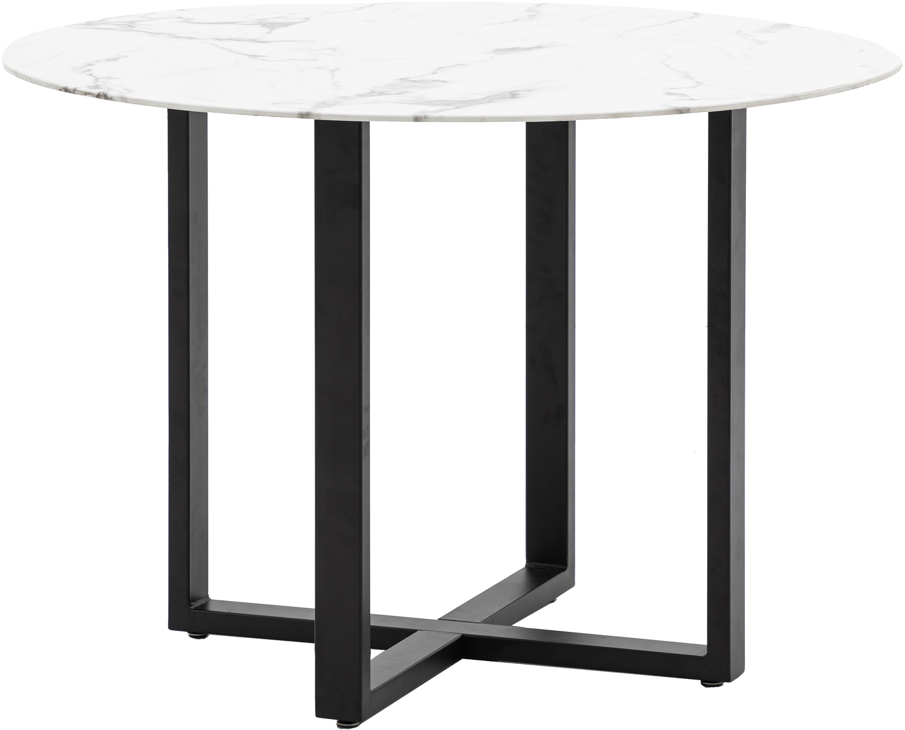Add a touch of dramatic modern luxury to your dining space. With an eye catching faux white marble glass top and bold black crossover legs, this dining table will make a statement. Perfect for a smaller spaces where you still want to make a impact, this table seats 4.