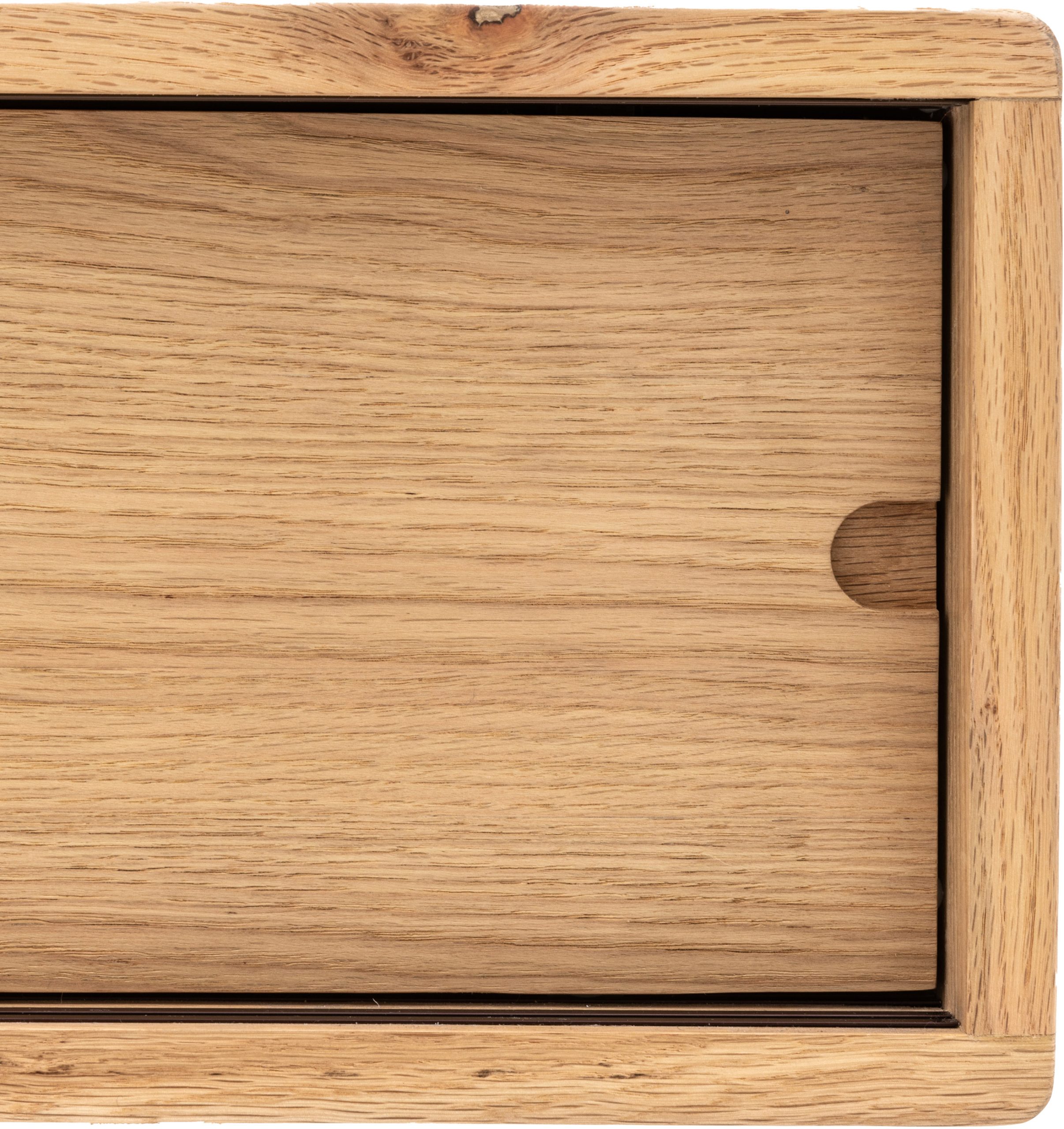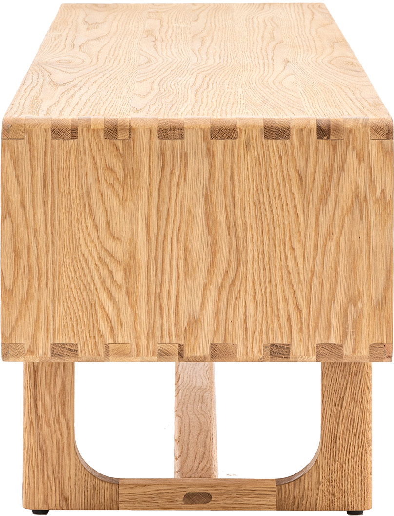 With its cut-out handles on the sliding doors and beautifully shaped underframe, this lovely media unit offers stunning design. It is crafted from the finest oak and oak structural veneers where practical, with a natural finish. Finger joints on the corners of the piece, a technique found on high quality cabinetry, give strength and a sense of purpose and tradition to create long-lasting, legacy furniture that can be collected and handed down through generations. Also available in a smoked oak finish. Matching pieces available.