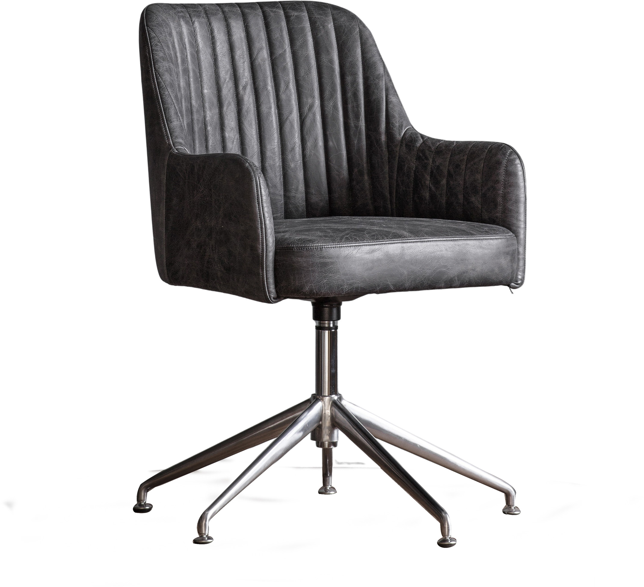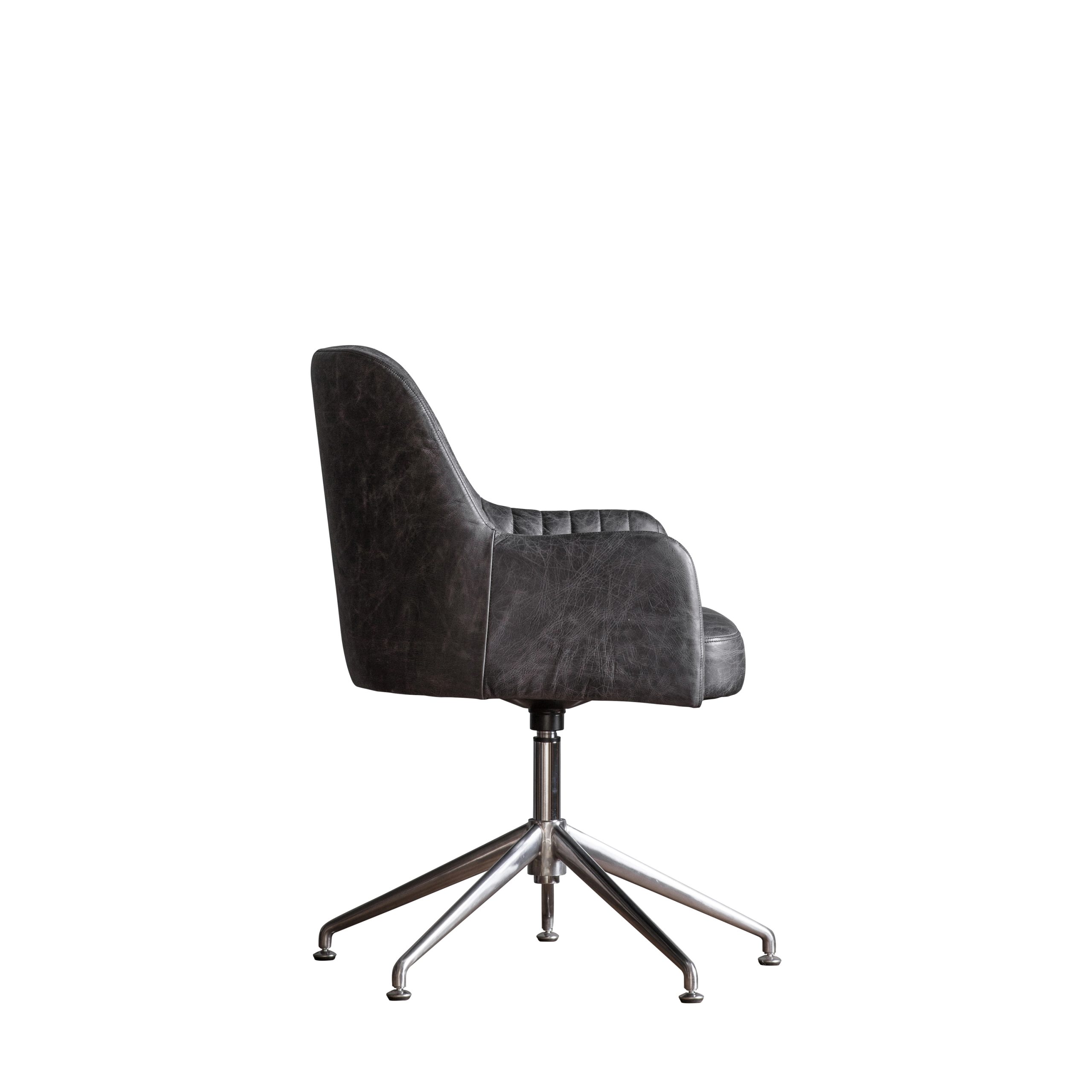 This modern swivel chair in antique ebony offers a quality stylish solution to home office working. The chair is upholstered in full leather hide with vertical stitching to add detail and has a lightly padded back and sides and a deep padded seat for comfort. This is paired with a stable base in a classy silver finish. Seat swivels but is not height adjustable.