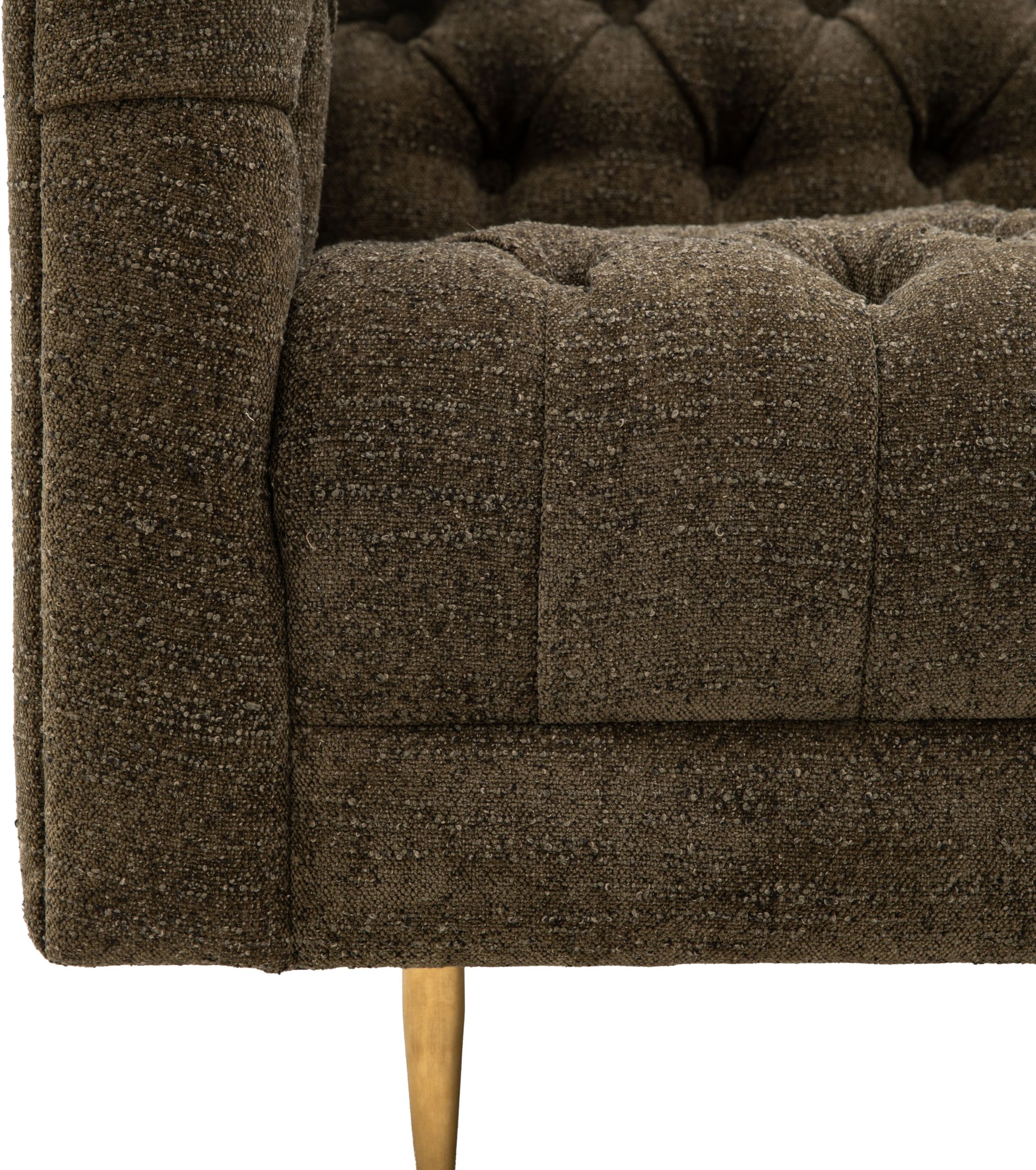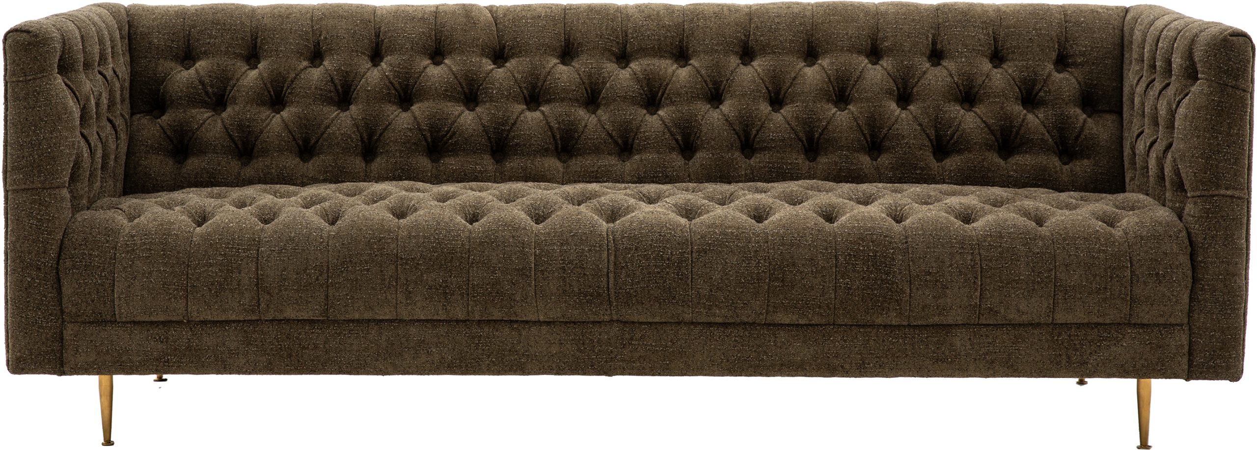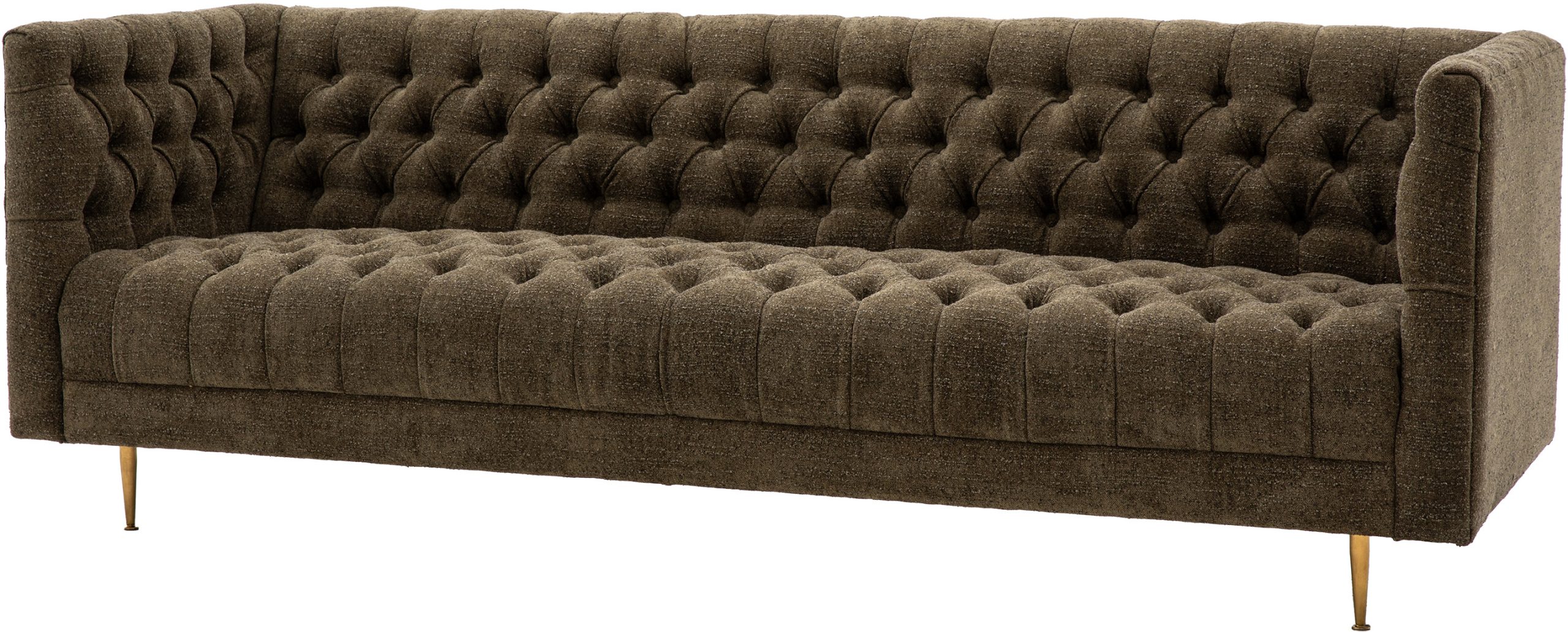 This beautiful sofa offers a stunning combination of traditional and contemporary design with its buttoning detail on the arms, seat and back, paired with the slim straight arms and slender, elegant feet. It is upholstered in lovely moss green fabric leather. Also available in brown leather.