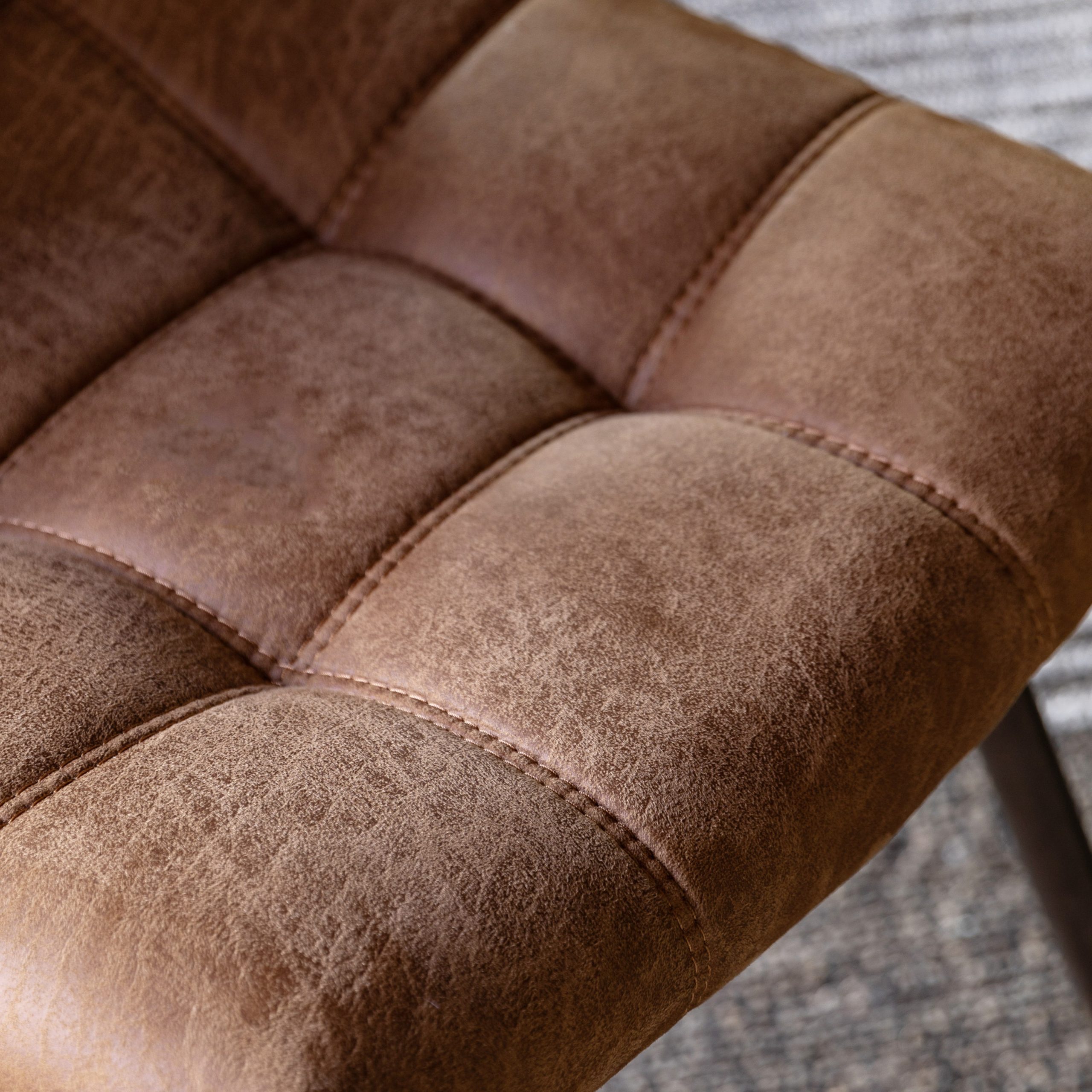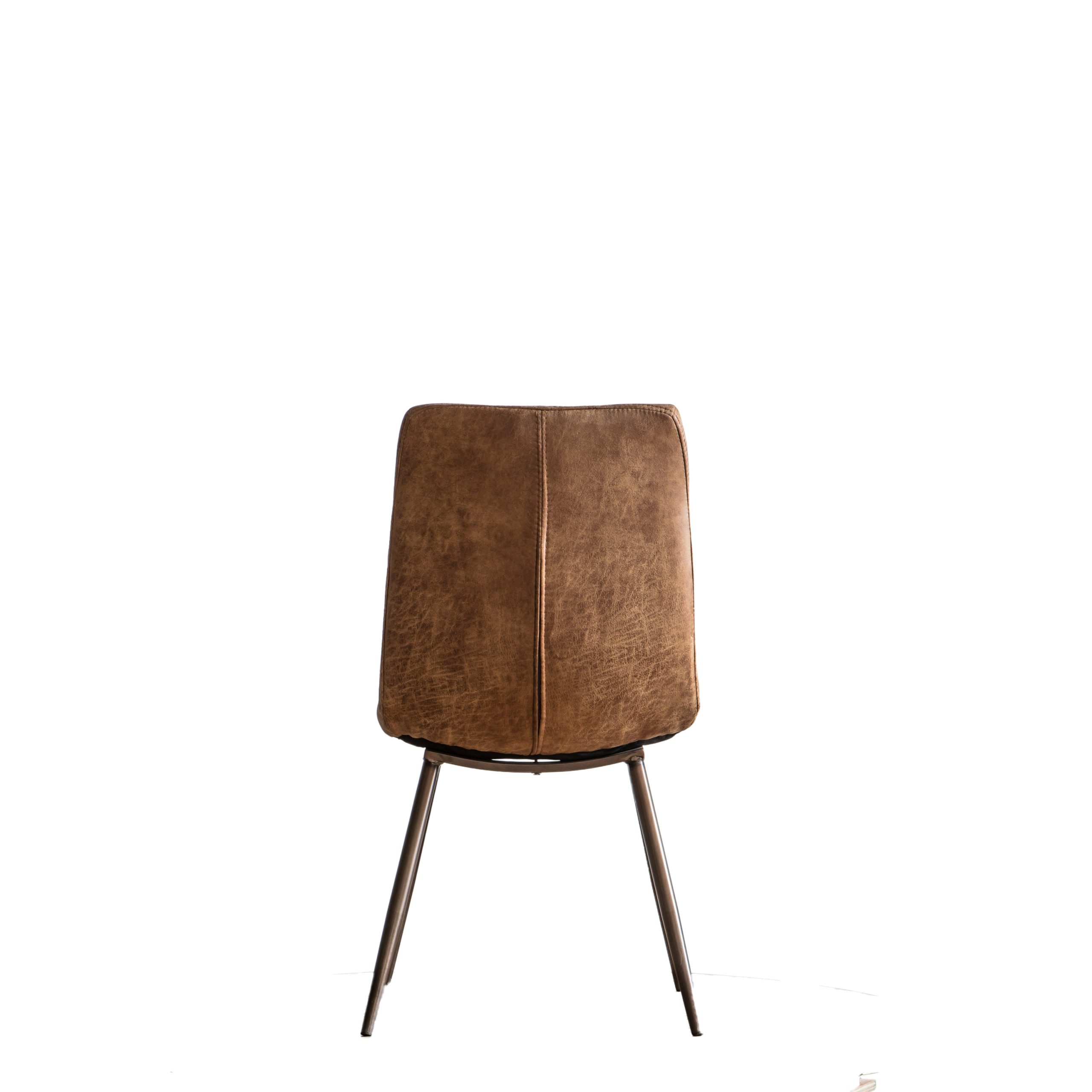 Stylish dining chair upholstered in faux leather with metal legs and extra stitched back detailing.