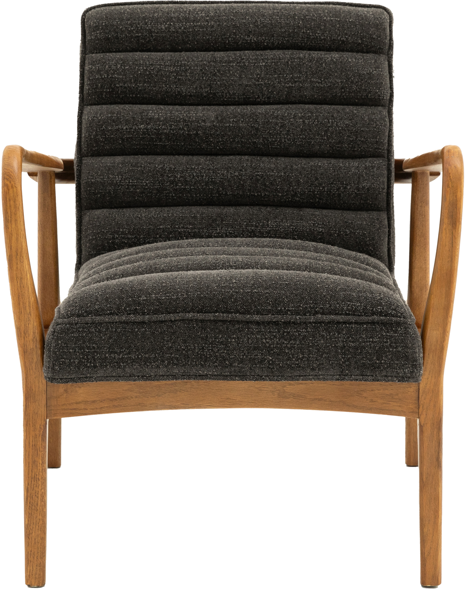 The Gallery Direct Datsun Armchair Charcoal Boucle Features a sleek wooden frame with beautifully curved arms, this chair is upholstered in a plush, boucle fabric in deep charcoal, offering both style and cozy relaxation.