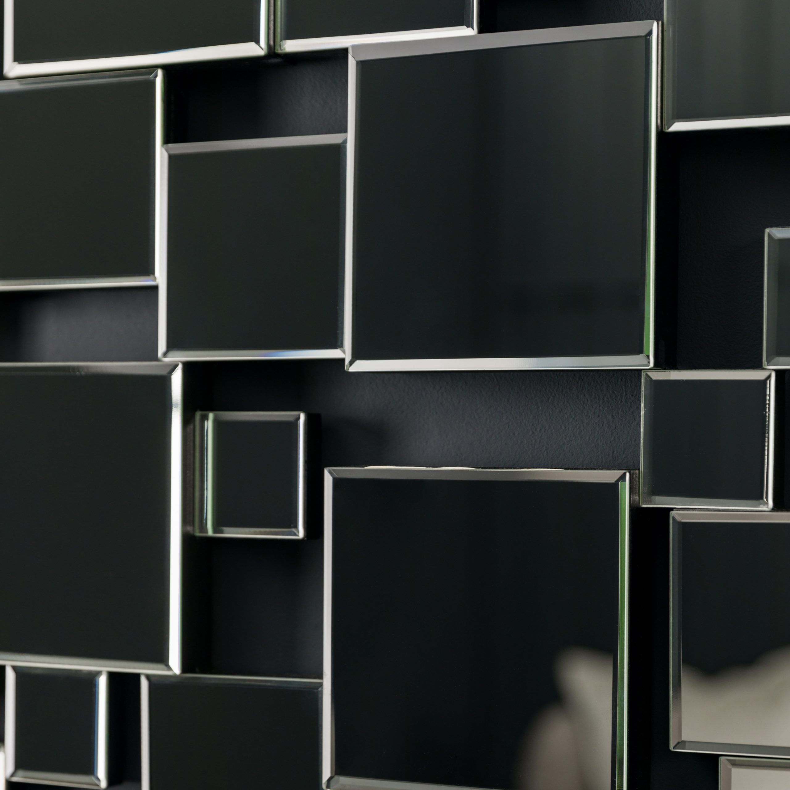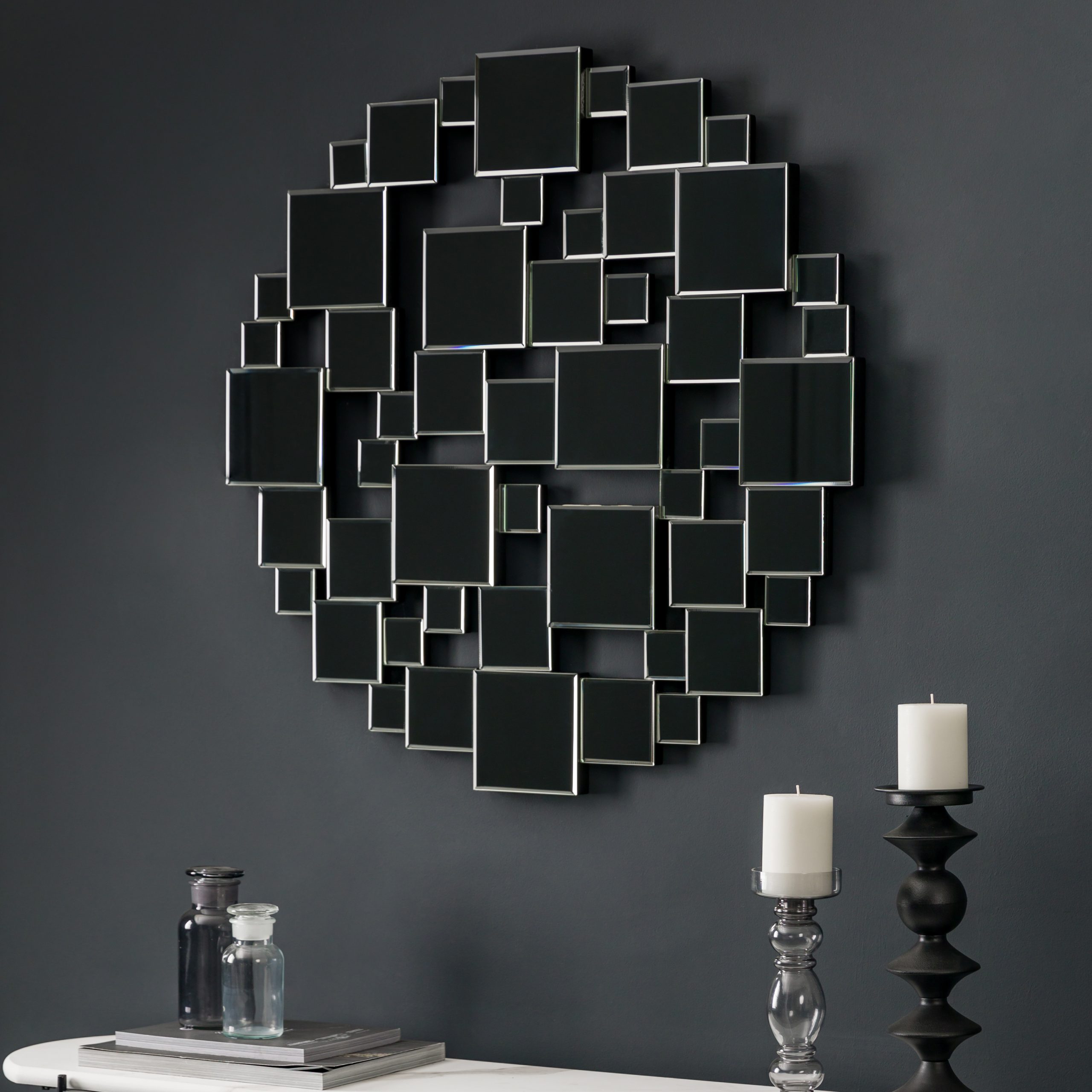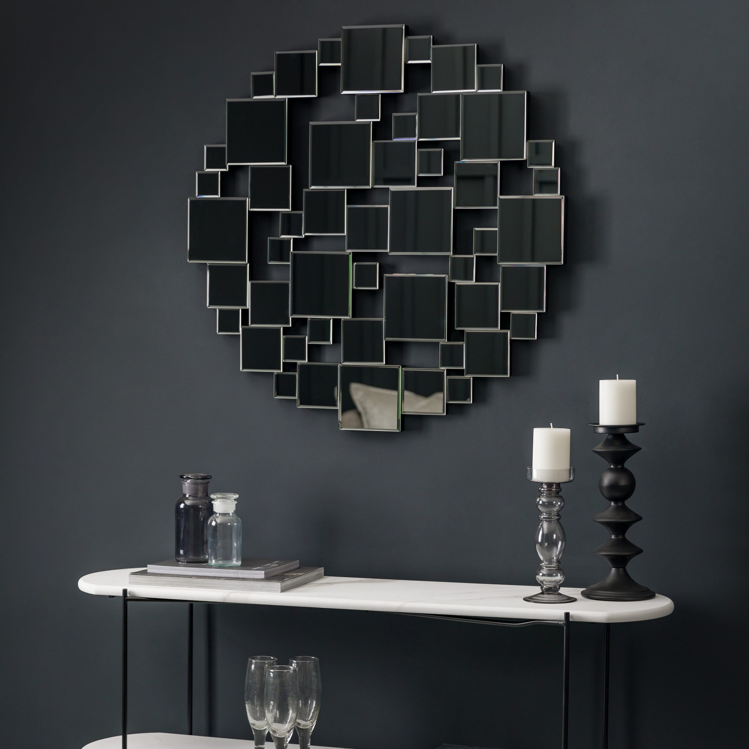 Round abstract mirror compiled of small square mirrors. This mirror is a true statement mirror and emulates a sculptural piece of wall art in it’s form.