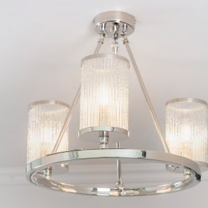 A unique classic styled chandelier in bright nickel plated finish. Inspired by hurricane lamps, the clear ribbed glass shades with bubble details create a perfect diffused light when lit by filament LED lamps . Each shade rests subtly on the rectangular section hoop and is suspended by three fixed arms.