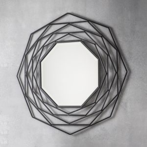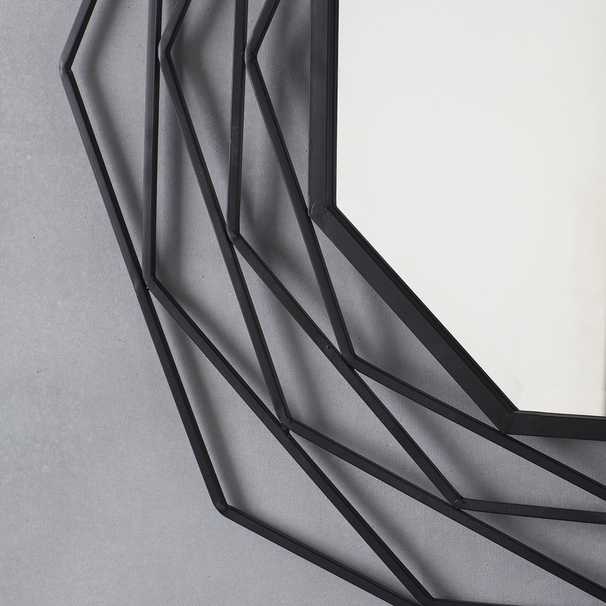 A unique geometric octagonal wall mirror with contemporary metal frame in a painted black finish with shaped centre mirror. Ready to hang.