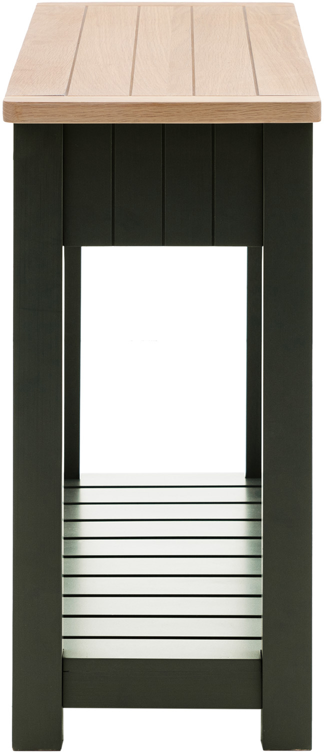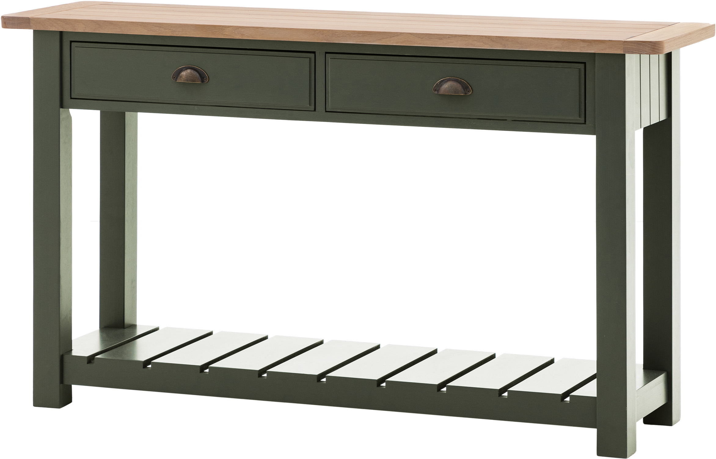 A modern update on a country classic, the Gallery Direct Eton 2 Drawer Console Moss is a versatile piece perfectly suited to both contemporary and rustic interiors. Featuring 2 drawers and a low shelf, the console table is perfect for living rooms, dining areas and kitchens alike, offering great additional storage. The hand painted subtly textured finish with metal drawer pulls and grooved & planked oak top add a modern twist to this country style console. Due to the handmade nature of this product colour variations may be present.
