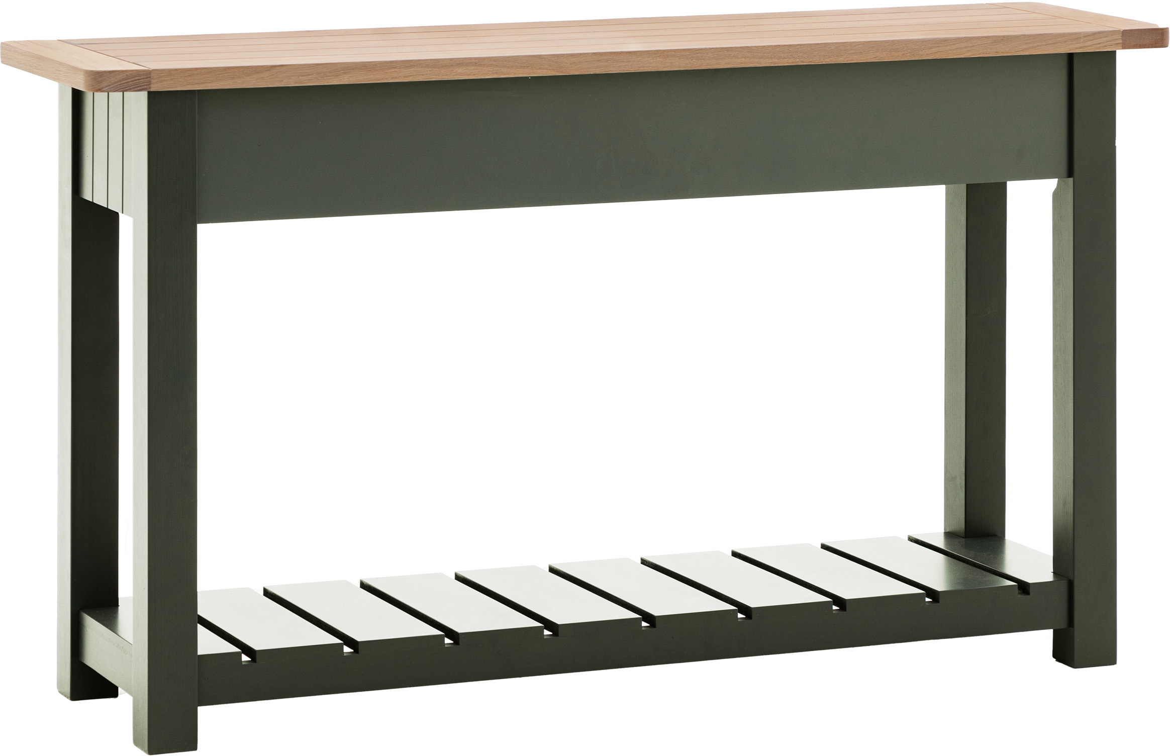 A modern update on a country classic, this console table is a versatile piece perfectly suited to both contemporary and rustic interiors. Featuring 2 Drawers and a low shelf, the console table is perfect for living rooms, dining areas and kitchens alike, offering great additional storage. The hand painted subtly textured finish with metal Drawer pulls and grooved & planked oak top add a modern twist to this country style console.