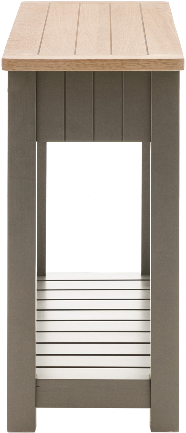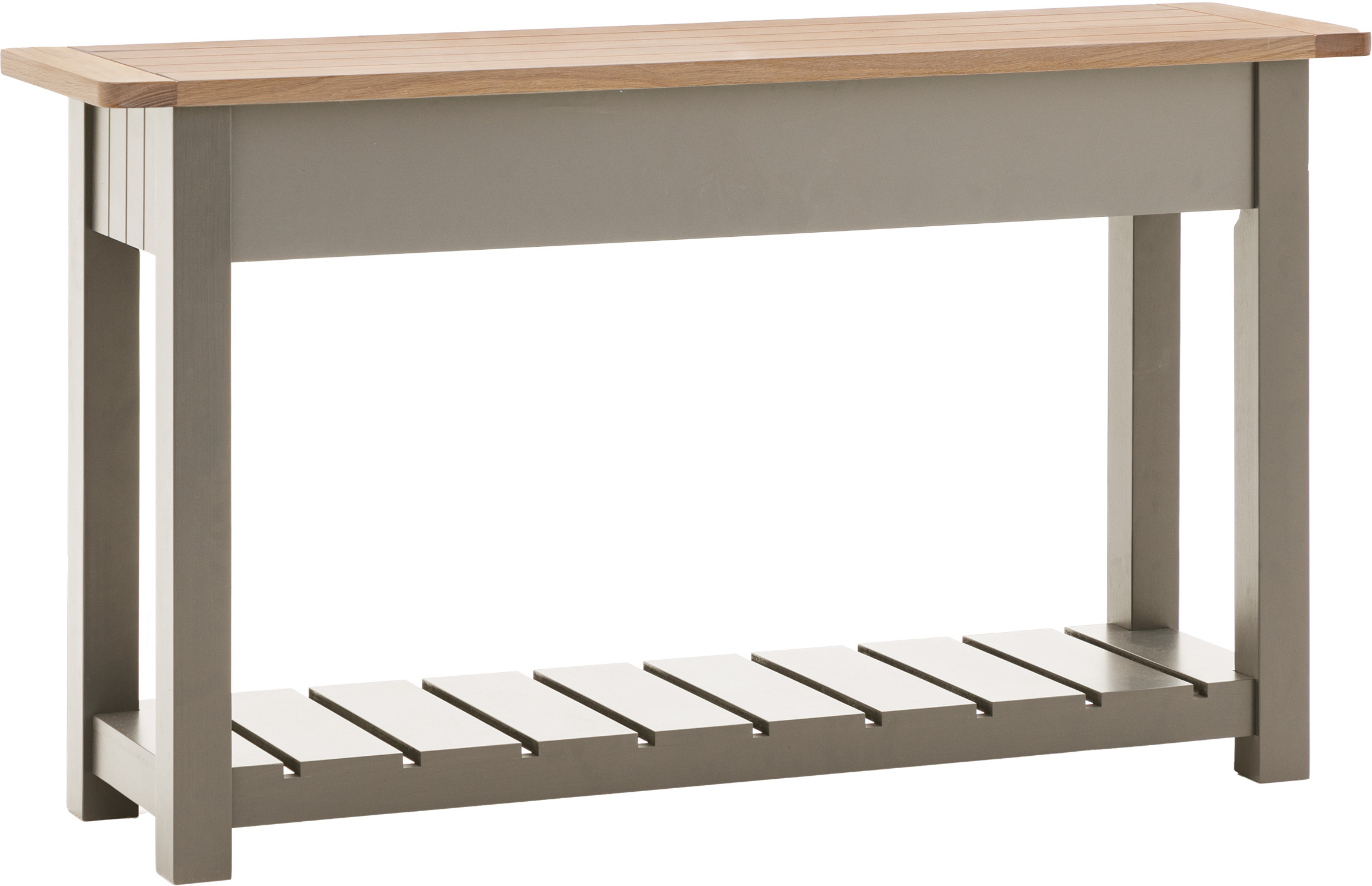 A modern update on a country classic, this console table is a versatile piece perfectly suited to both contemporary and rustic interiors. Featuring 2 Drawers and a low shelf, the console table is perfect for living rooms, dining areas and kitchens alike, offering great additional storage. The hand painted subtly textured finish with metal Drawer pulls and grooved & planked oak top add a modern twist to this country style console.