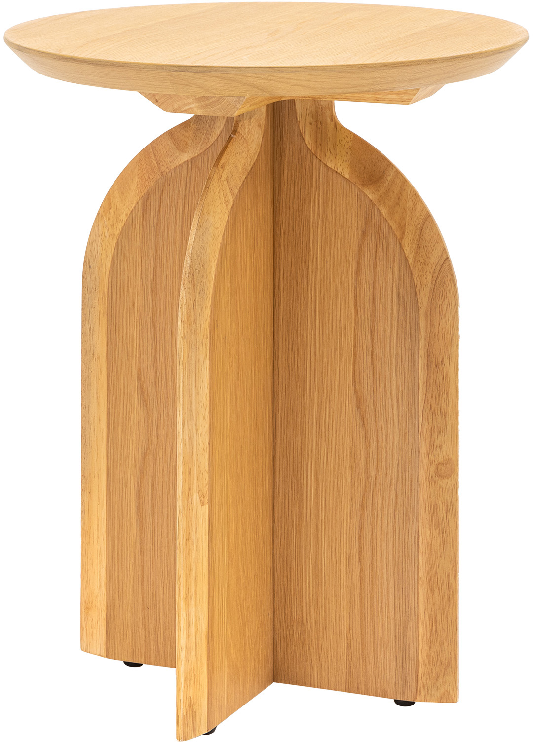 Designed to highlight the use of geometric design, with a nod towards retro style but in a more modern format, this beautiful side table features a lovely round top, with this form echoed on the tops of the legs. It is made using oak veneers and solids, where practical, with a natural matt finish. Matching pieces available.