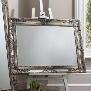 Pretty baroque style wood framed mirror in a hand applied silver leaf finish.
