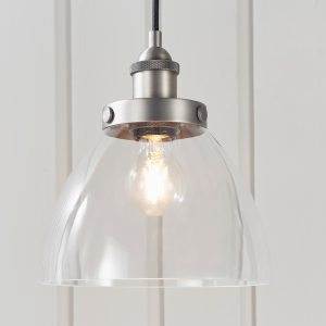 An authentic ‘resto’ style industrial pendant, finished in brushed silver paint with authentic knurled lamp holder details and clear glass shades . Suspended from height adjustable black fabric flex, pair with filament LED lamps for that perfect industrial style. The perfect addition for today’s stylish homes to create that on trend bar, bistro look.